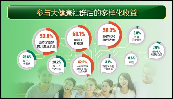 第三, 社群参与者表示参与社群活动后,收获改变的前三项依次是:提升生活质量(53.8%),学到新知识(53.1%),身体状况改善(50.3%)
