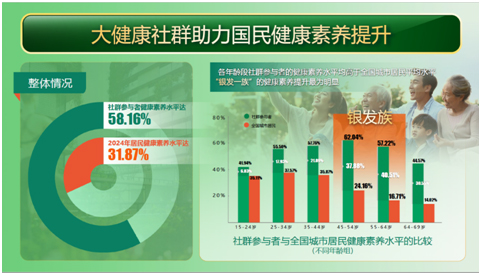 今年的调研显示,对比2024我国居民健康素养水平达到31.87%,社群参与者的健康素养水平为58.16%,充分印证大健康社群干预在促进公众健康素养提升、推动人口高质量发展方面的科学性、实用性和有效性。以下为今年调研工作的部分数据和结论呈现: