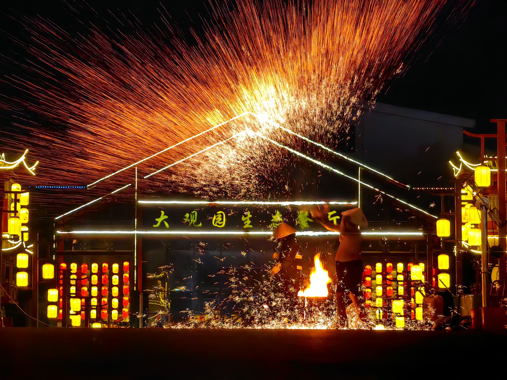 开幕式后,精彩的非遗民俗展演轮番登场:川剧变脸、京剧大碗茶、爵士舞、非遗旱船等表演赢得阵阵掌声;打铁花表演将千度铁水化作漫天星辰,场面震撼。国潮美食街也同步开放,特色小吃、网红甜品、烧烤啤酒等美食吸引众多游客驻足品尝。