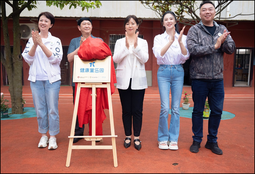 (从左至右)安利公益基金会理事长彭翔、遵义市关工委常务副主任王大忠、中国关工委健康体育发展中心健康童乐园项目副主任于明正、张雨绮、姜超为健康童乐园揭牌
