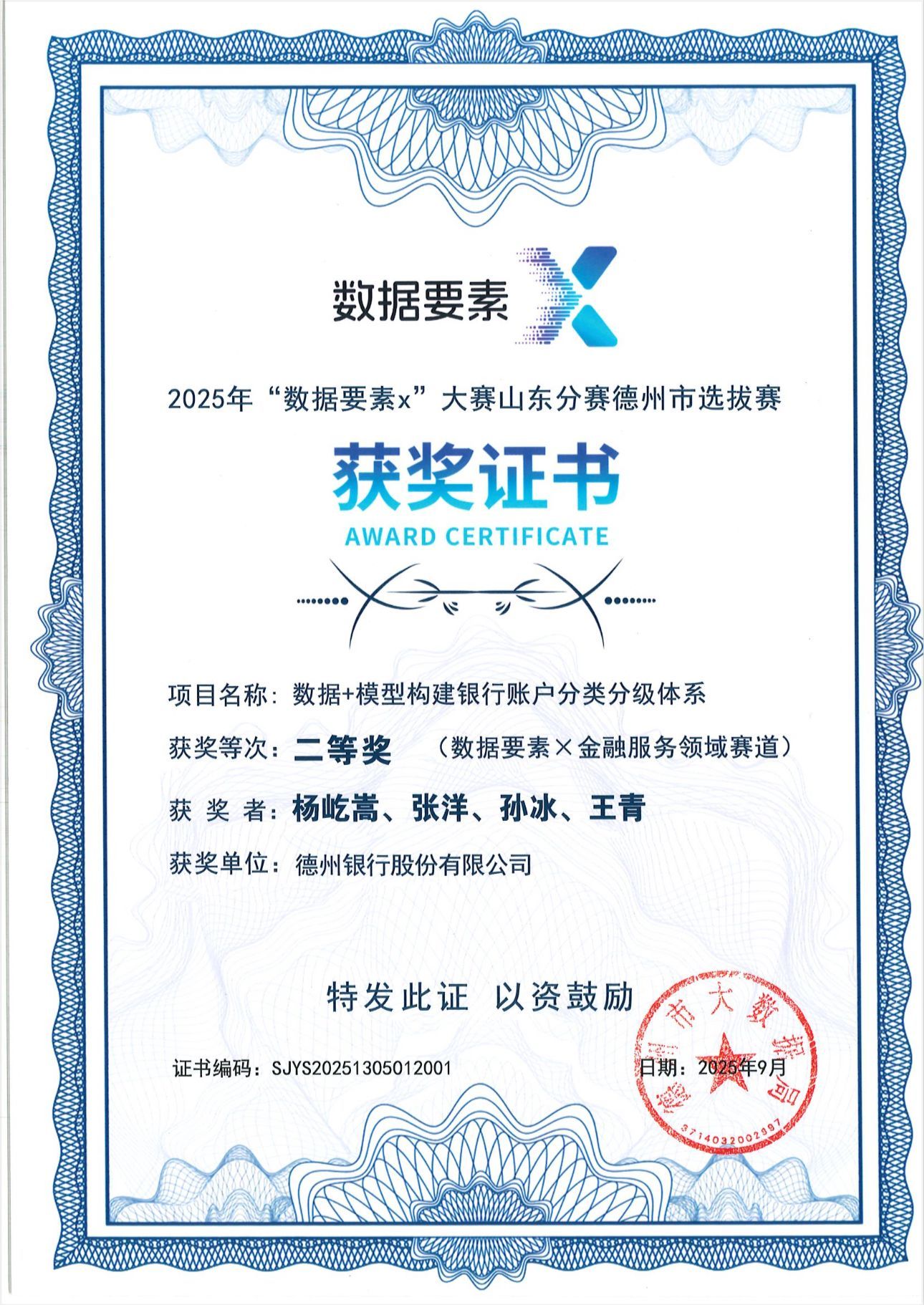 近日,2025年“数据要素×”大赛山东分赛决赛圆满落幕,德州银行“数据+模型构建银行账户分类分级系统”项目,从众多参赛单位中脱颖而出,荣获德州市选拔赛金融服务赛道二等奖,并代表德州市参加山东分赛决赛,荣获山东分赛决赛金融服务赛道优秀奖。