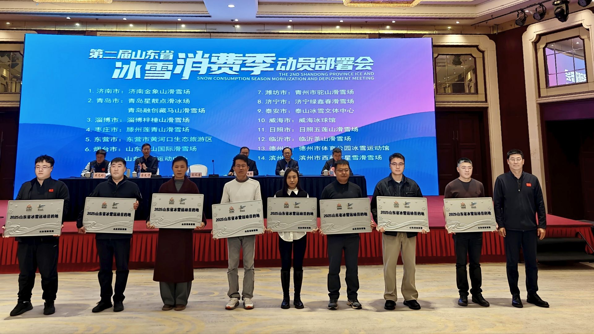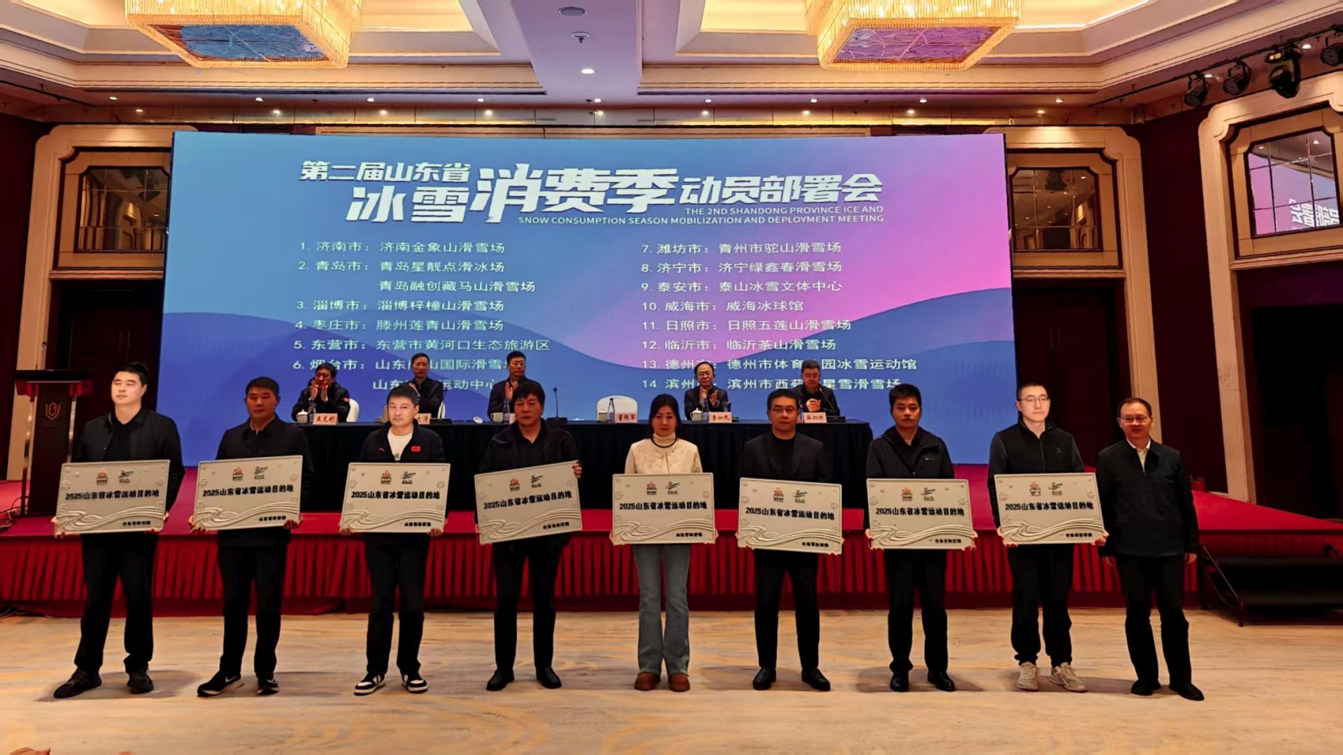 会上,为德州市体育公园冰雪运动馆、滨州市西苑七星雪滑雪场、临沂茶山滑雪场等16家2025年冰雪运动目的地授牌。