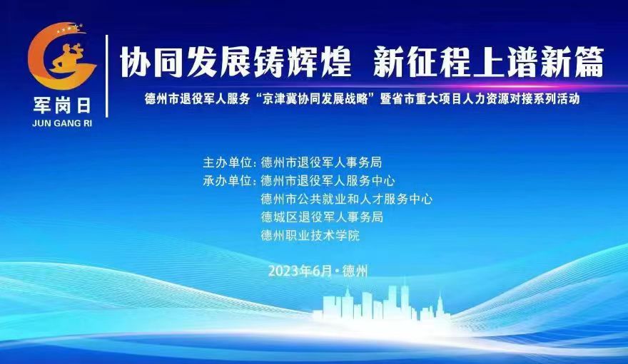 为充分发挥退役军人人力资源重要作用,更好地服务省市重大项目建设,助推全市经济高质量发展和退役军人充分就业、体面就业,德州市退役军人事务局将于6月28日举办“退役军人服务‘京津冀协同发展战略’暨省市重大项目人力资源对接系列活动德州专场”招聘活动。