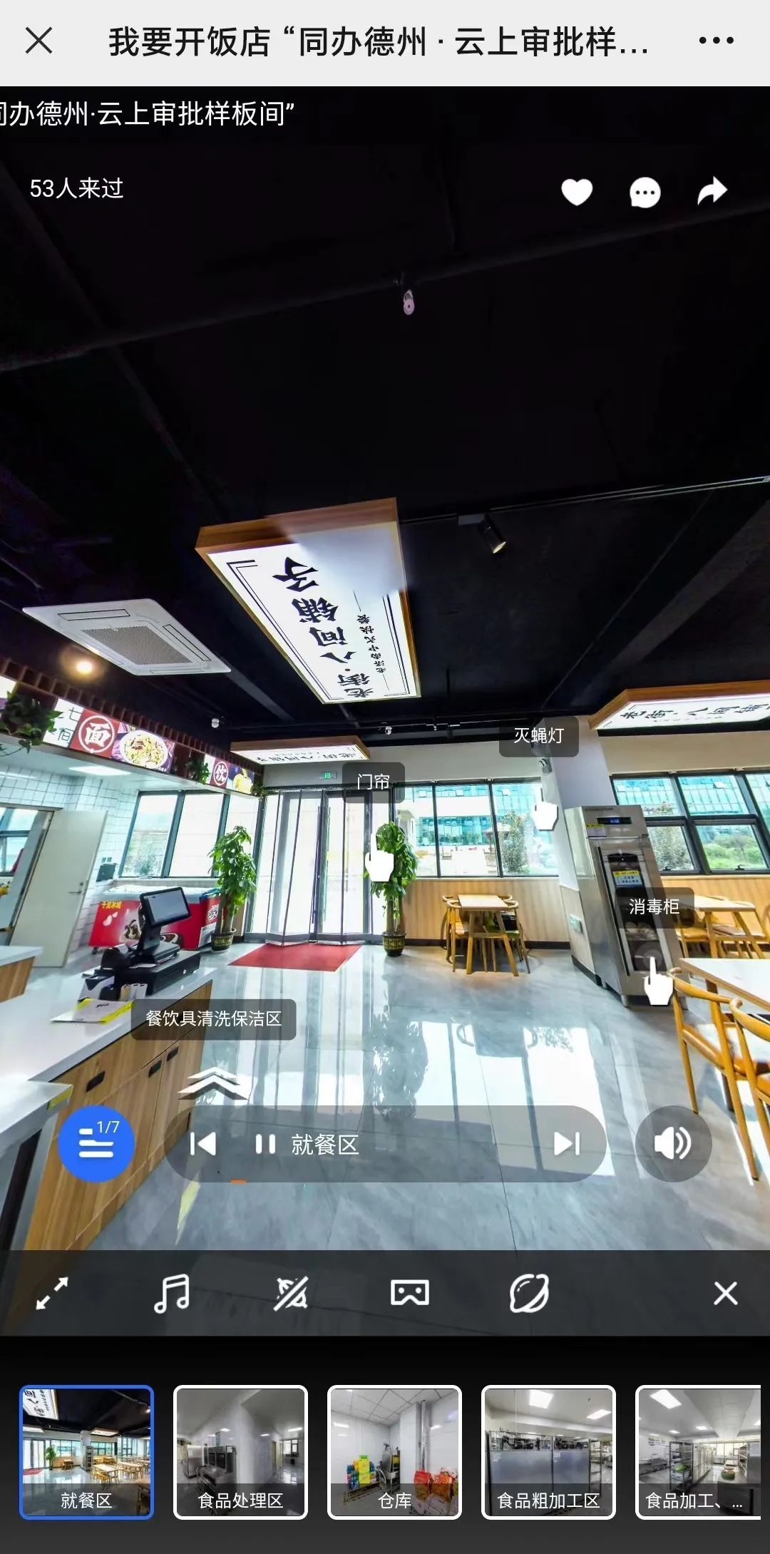 “同办德州·云上审批样板间”通过选取部分行业标准现场案例作为“样板”,利用VR虚拟现实技术,将线下实景还原到线上,并搭配“外弹式”的热点标注和数字人语音讲解,制作成VR实景现场标准化“样板间”,企业、群众随时随地可以使用手机和电脑“身临其境”。对照“同办德州·云上审批样板间”,可逐项了解所有核查标准。每项核验标准都配有重点标注和语音解说,全景式、直观化的一次性备勘指导,推动受理审查和现场勘验并联推进。