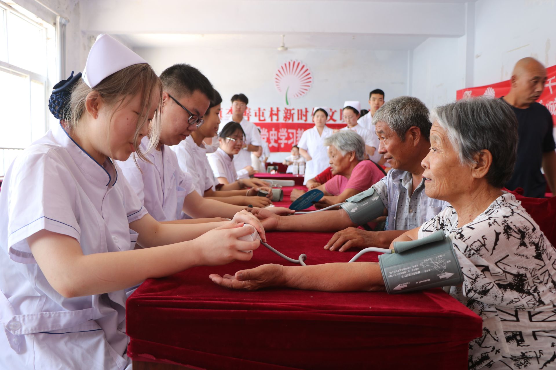 义诊现场,志愿者设置了血压测量服务咨询点,为村民现场量血压,耐心答疑解惑、测量健康指标,提出日常预防、保健方案及治疗建议,对村民进行健康监测,加强村民对疾病和慢性病的认识和防范,同时提升护理专业学生的理论实操技能。