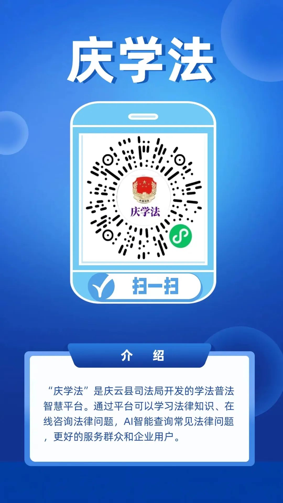 7月10日,庆云县司法局开发的集学法、考法、用法、咨询、解答于一体的“庆学法”学法普法智慧平台上线。“庆学法”无需下载安装任何软件,直接微信扫描二维码,即可进入主题界面。
