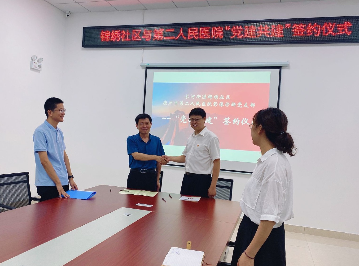 为充分发现党建引领的作用,实现党组织优势互补、区域发展,努力构建“资源共享、优势互补、互相促进、共同提高”的党建工作新格局,近日,长河街道锦绣社区与德州市第二人民医院影像诊断党支部携手共建,启动了“党建共建”签约仪式。