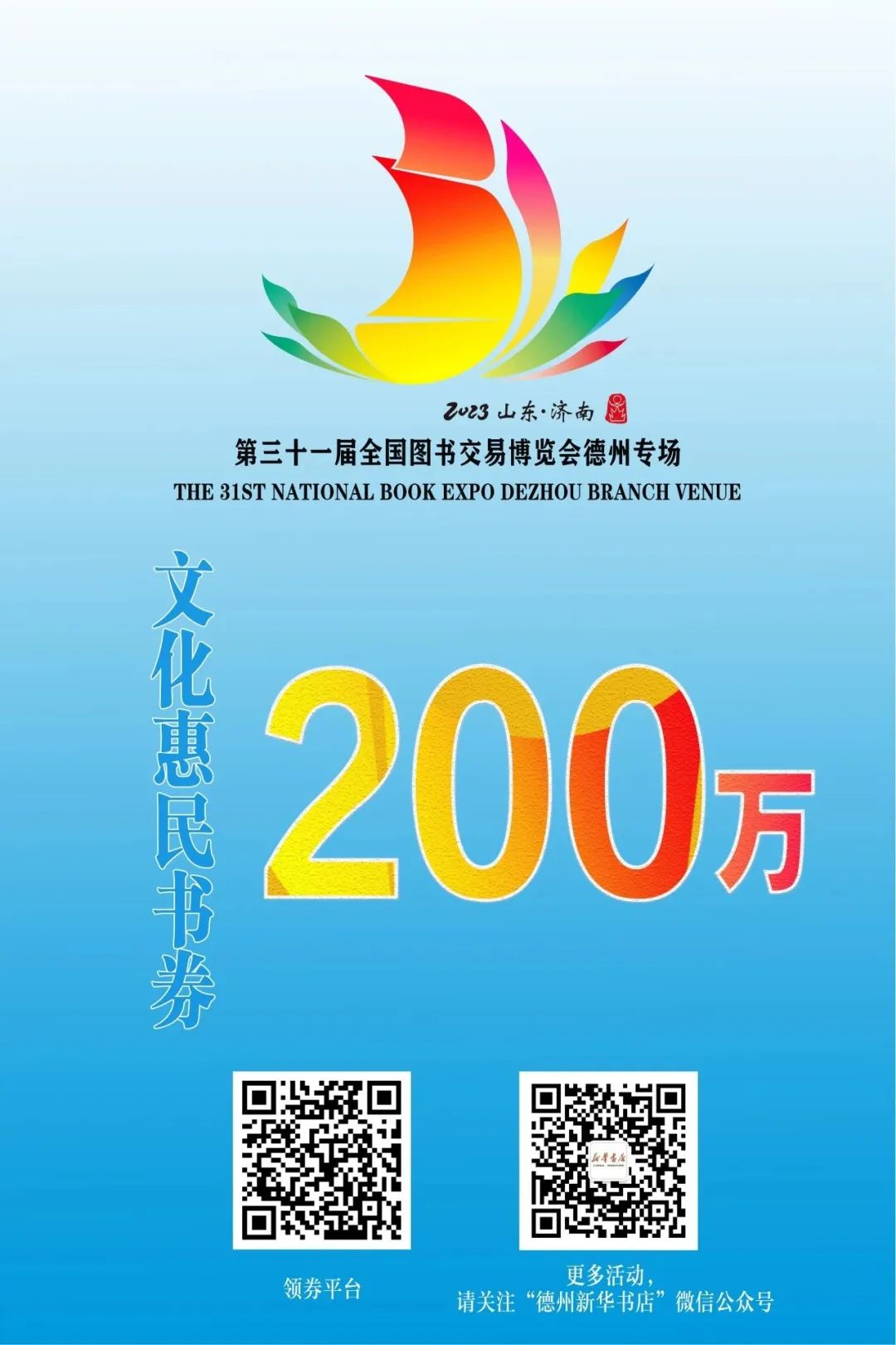 (1)书博会期间,读者在“第31届书博会德州专场领券平台”扫码领“文化惠民书券”,消费满50元减20元,满100元减40元,满200元减80元惠民书券。
