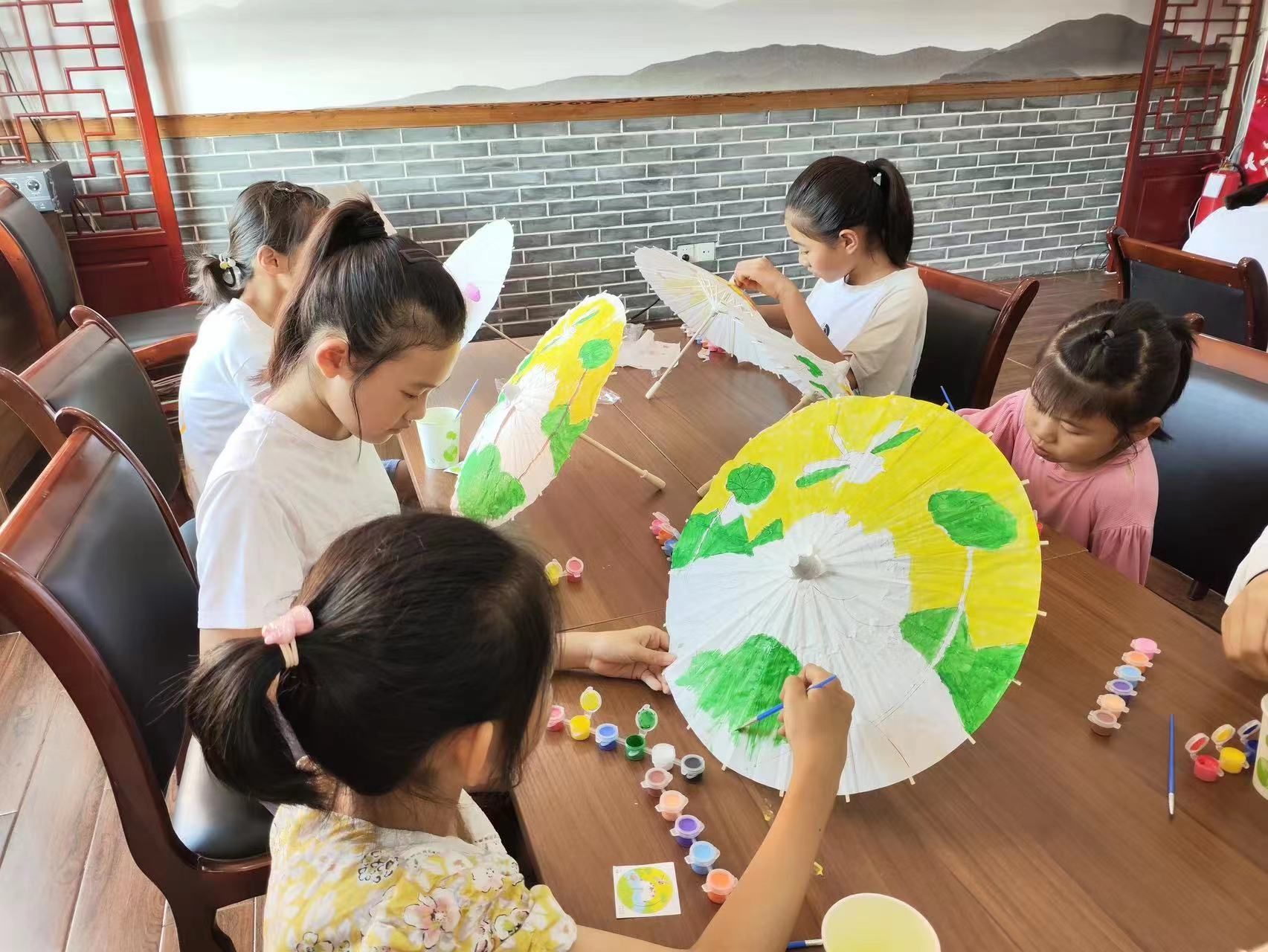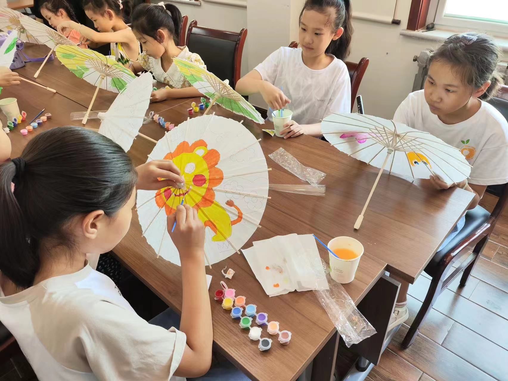 我画一朵花、你画一片叶、他画一棵树,孩子们用画笔和颜料,专心致志地在空白的油纸伞上画出自己喜欢的图案。