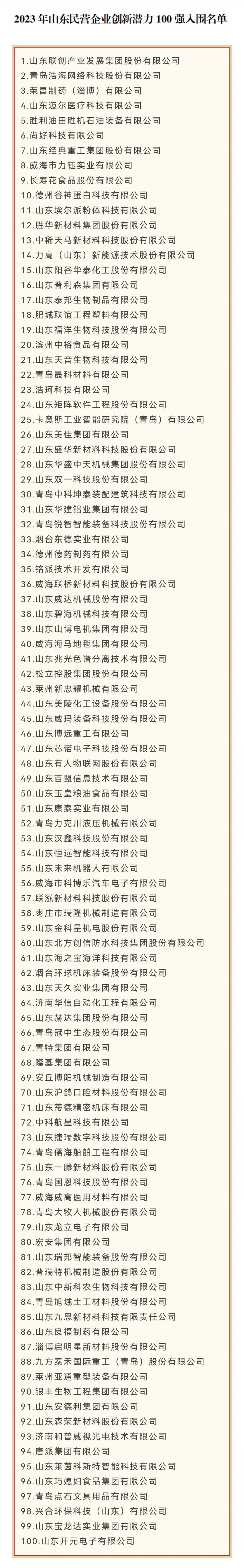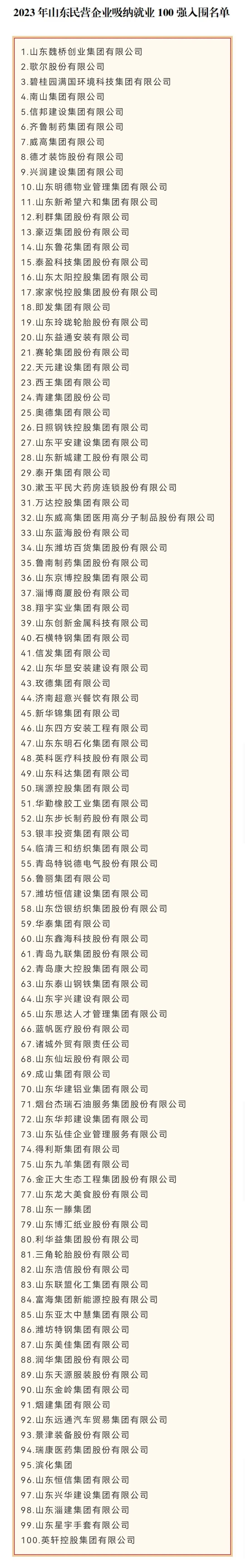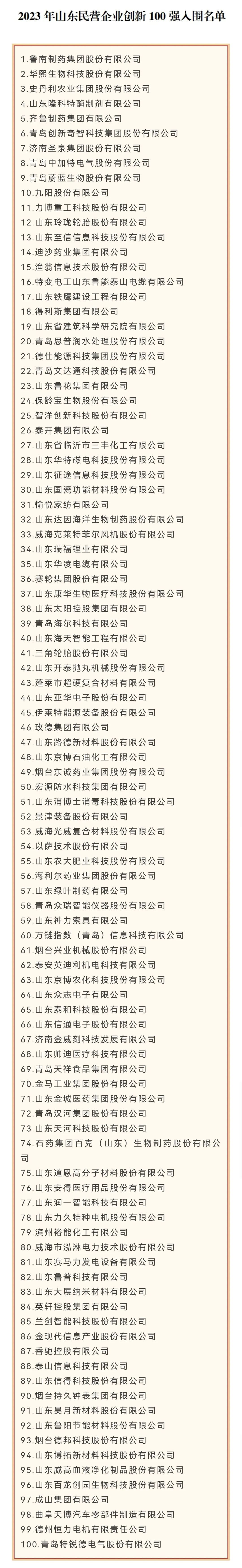 活动自5月份启动以来,按规定程序完成了企业申报、各市推荐、专家评审、征求成员单位意见等程序,形成“2023年山东民营企业100强入围名单”。按照公开、公平、公正的原则,现将该名单向社会公示,公示期为3日,欢迎社会各界监督。入围企业若存在重大违法失信行为或其他不符合参评条件的问题,请向工作组办公室反映。