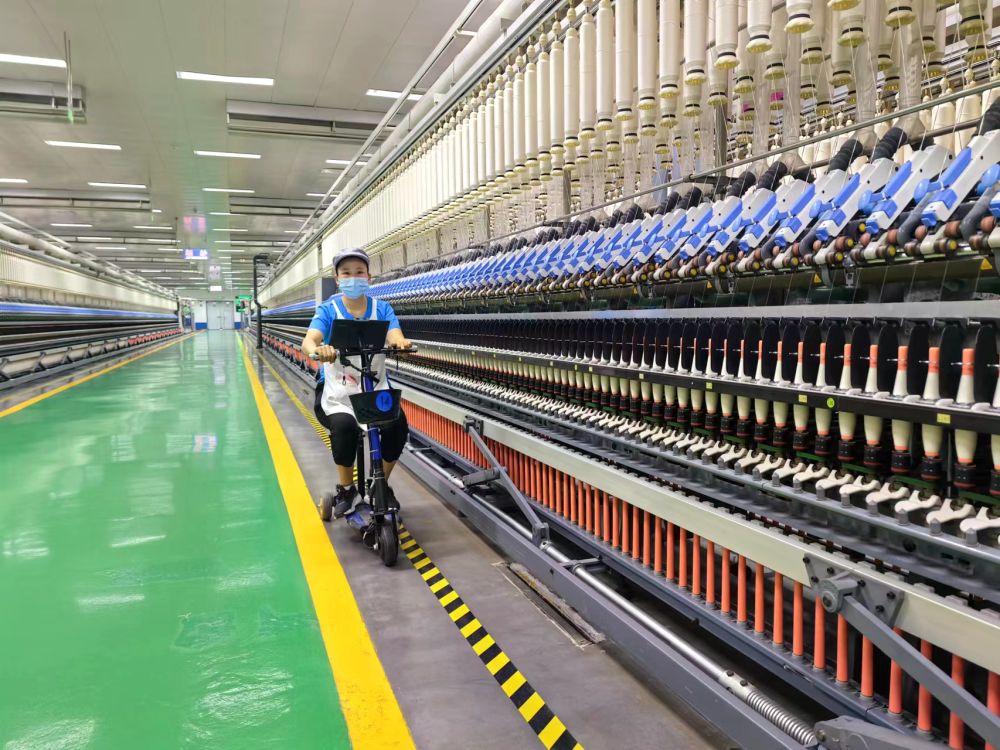 纱锭飞转,将一道道肉眼难见的细纱纺成纱锭。几名女工骑着电动车穿行其间,伸手轻轻一勾,将断纱接上。