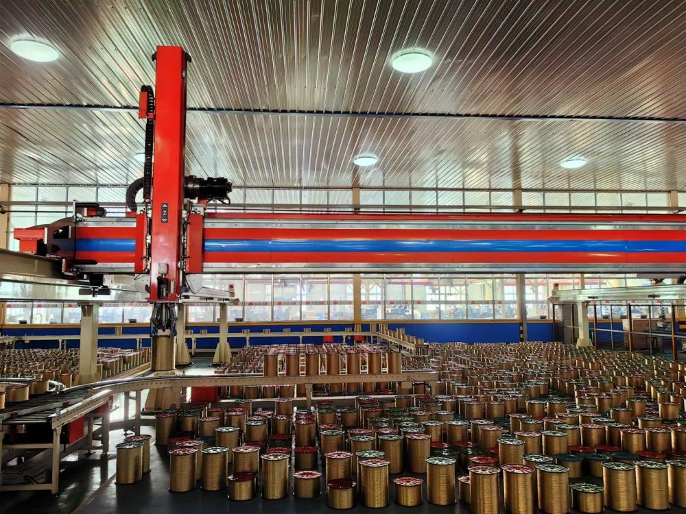 在山东大业股份有限公司智能化检配中心,龙门吊自动抓取钢圈。新华社记者陈国峰 摄