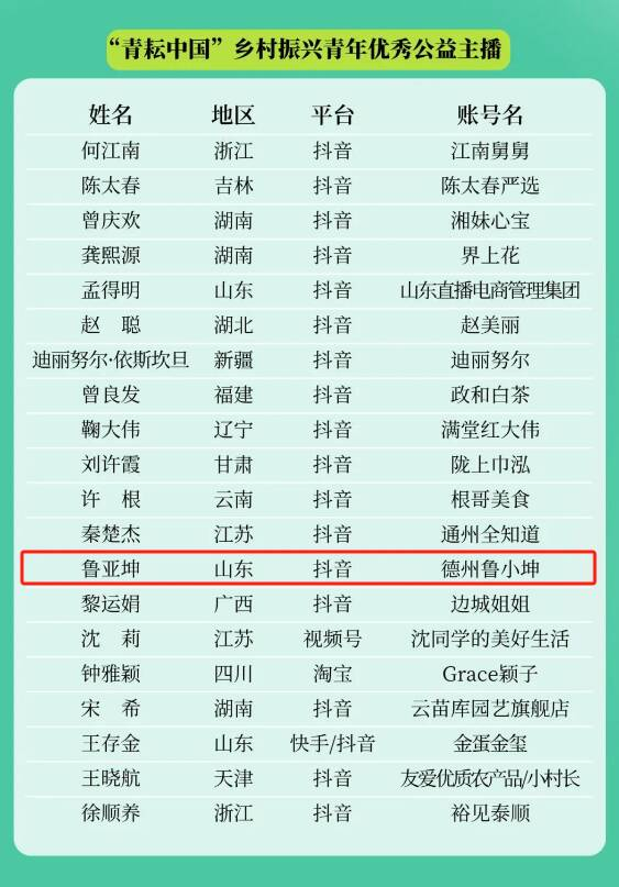 厚植爱农情怀·贡献青春力量——2023寻访“青耘中国”乡村振兴青年公益主播活动评选出全国100强青年公益主播。其中,代表山东省参选的德州鲁小坤(抖音平台账号名,原名鲁亚坤)荣获“青耘中国”乡村振兴青年优秀公益主播。