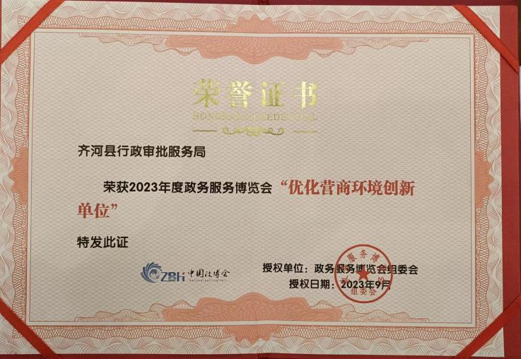 9月25日至28日,“2023中国政务服务博览会暨首届人力资源服务产业高质量发展峰会”在武汉举行。齐河县行政审批服务局荣获2023中国政博会“优化营商环境创新单位”奖项。