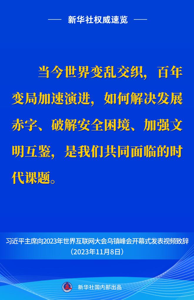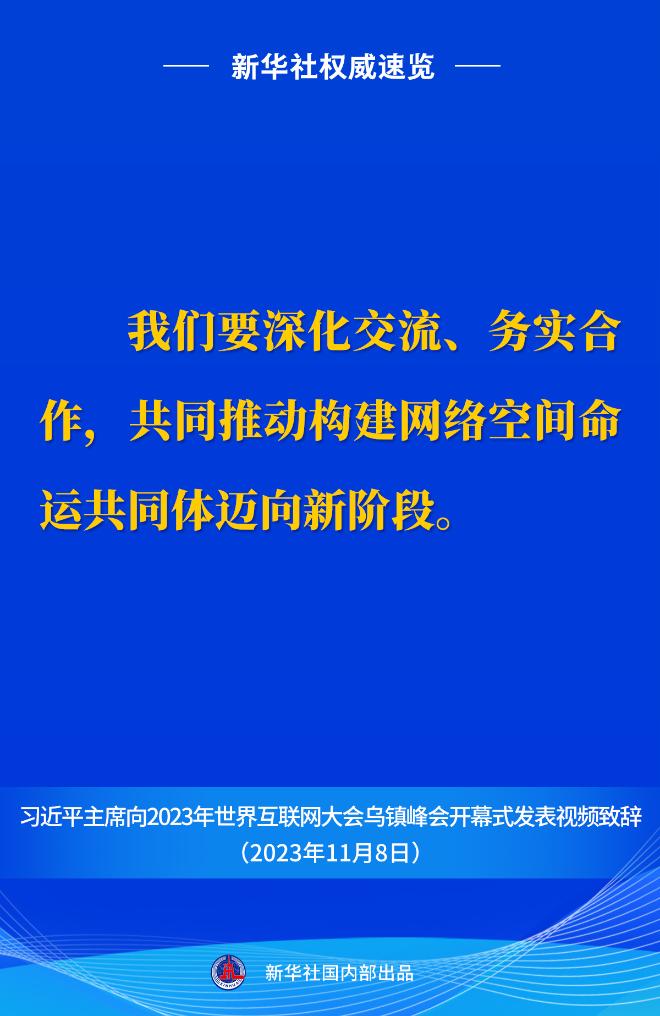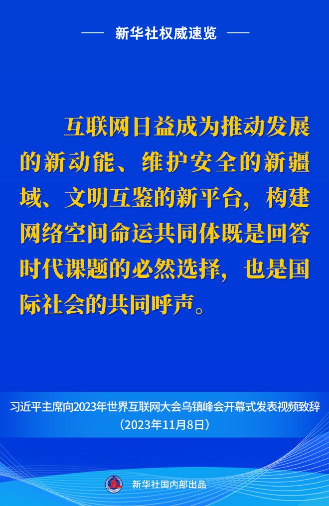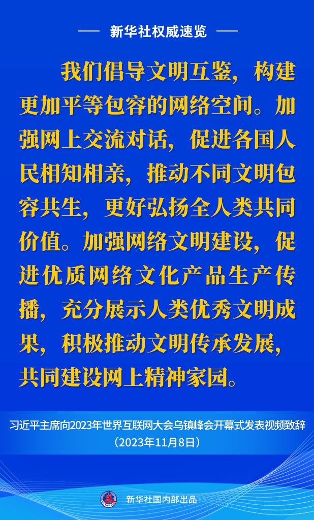 新华社权威速览丨习近平主席向2023年世界互联网大会乌镇峰会开幕式视频致辞金句 2023-11-08 21:09 新华社 0 11月8日上午,国家主席习近平向2023年世界互联网大会乌镇峰会开幕式发表视频致辞。一起来看金句。