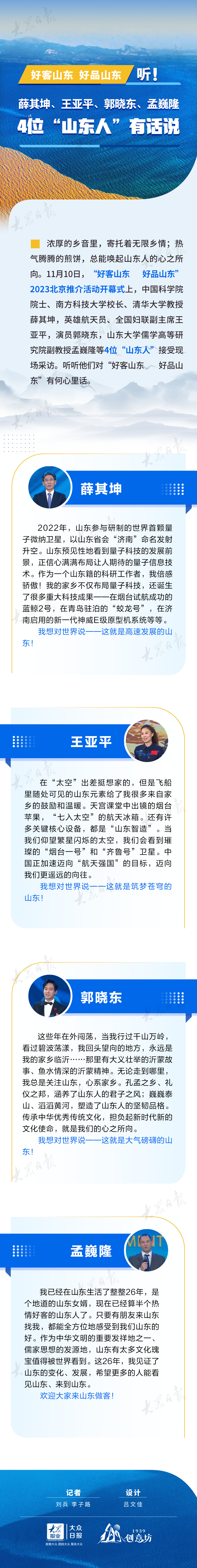 听!薛其坤、王亚平、郭晓东、孟巍隆4位“山东人”有话说 2023-11-10 18:32 大众日报客户端 0 浓厚的乡音里,寄托着无限乡情;热气腾腾的煎饼,总能唤起山东人的心之所向。11月10日,“好客山东 好品山东”2023北京推介活动开幕式上,中国科学院院士、南方科技大学校长、清华大学教授薛其坤,英雄航天员、全国妇联副主席王亚平,演员郭晓东,山东大学儒学高等研究院副教授孟巍隆等4位“山东人”接受现场采访。听听他们对“好客山东 好品山东”有何心里话。
