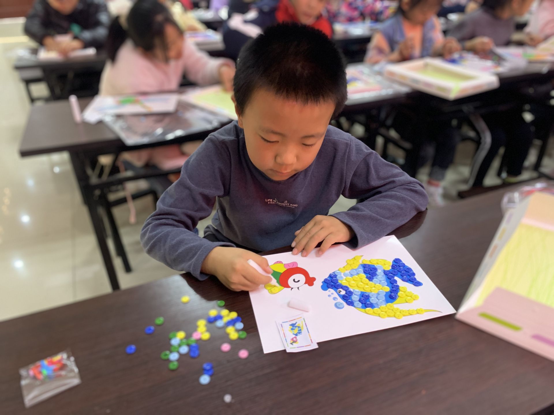 活动开始,工作人员首先介绍纽扣画的制作方法及注意事项。随后,在工作人员的指导下,孩子们充分发挥想象力,将一粒粒五颜六色的纽扣粘贴在图画上,不一会儿,一幅幅生动而精美的纽扣画完成了,各式各样的图画呈现在眼前。看着自己亲手制作的作品,孩子们互相展示,露出了开心的笑脸,享受着成功的喜悦。