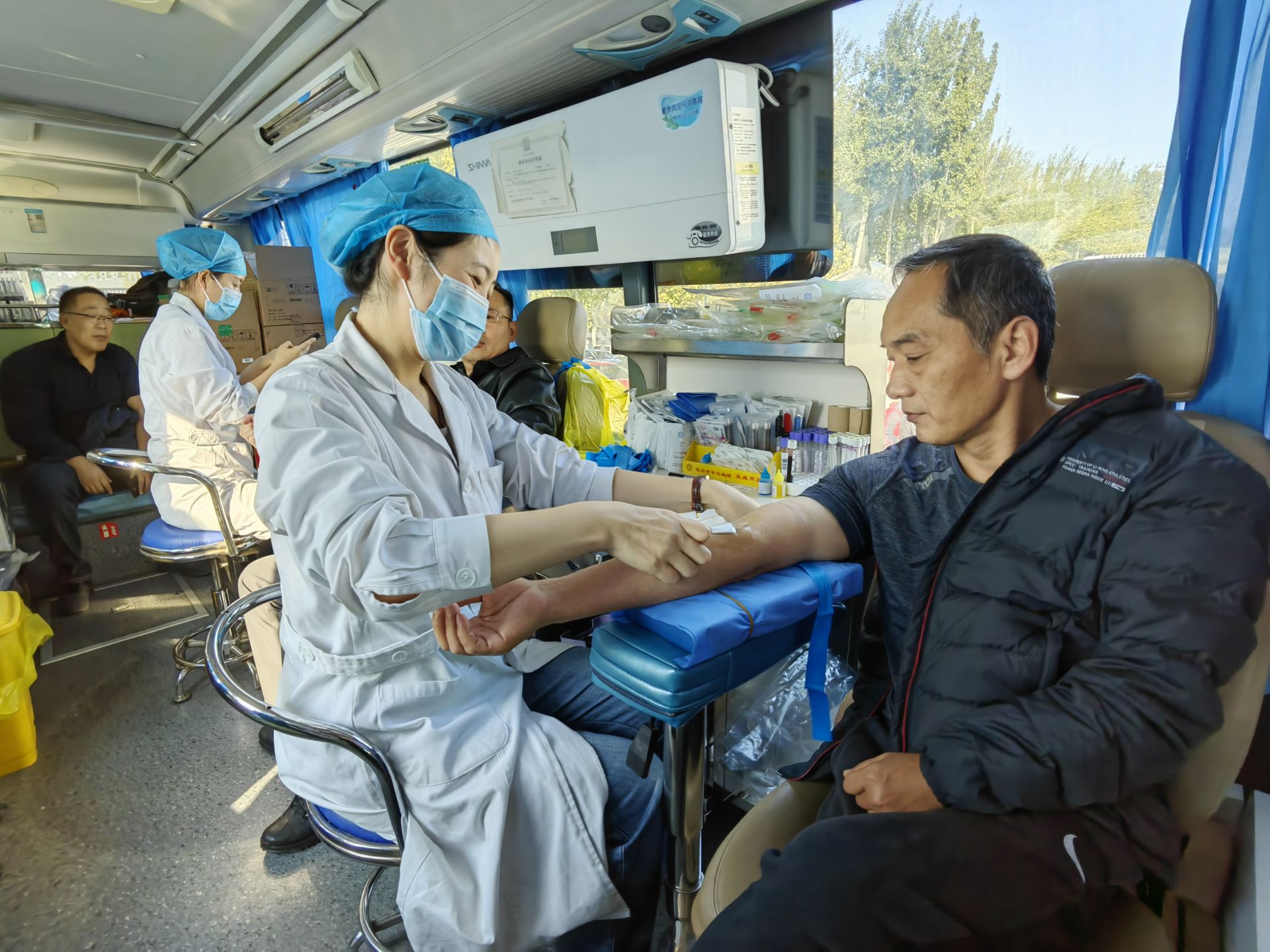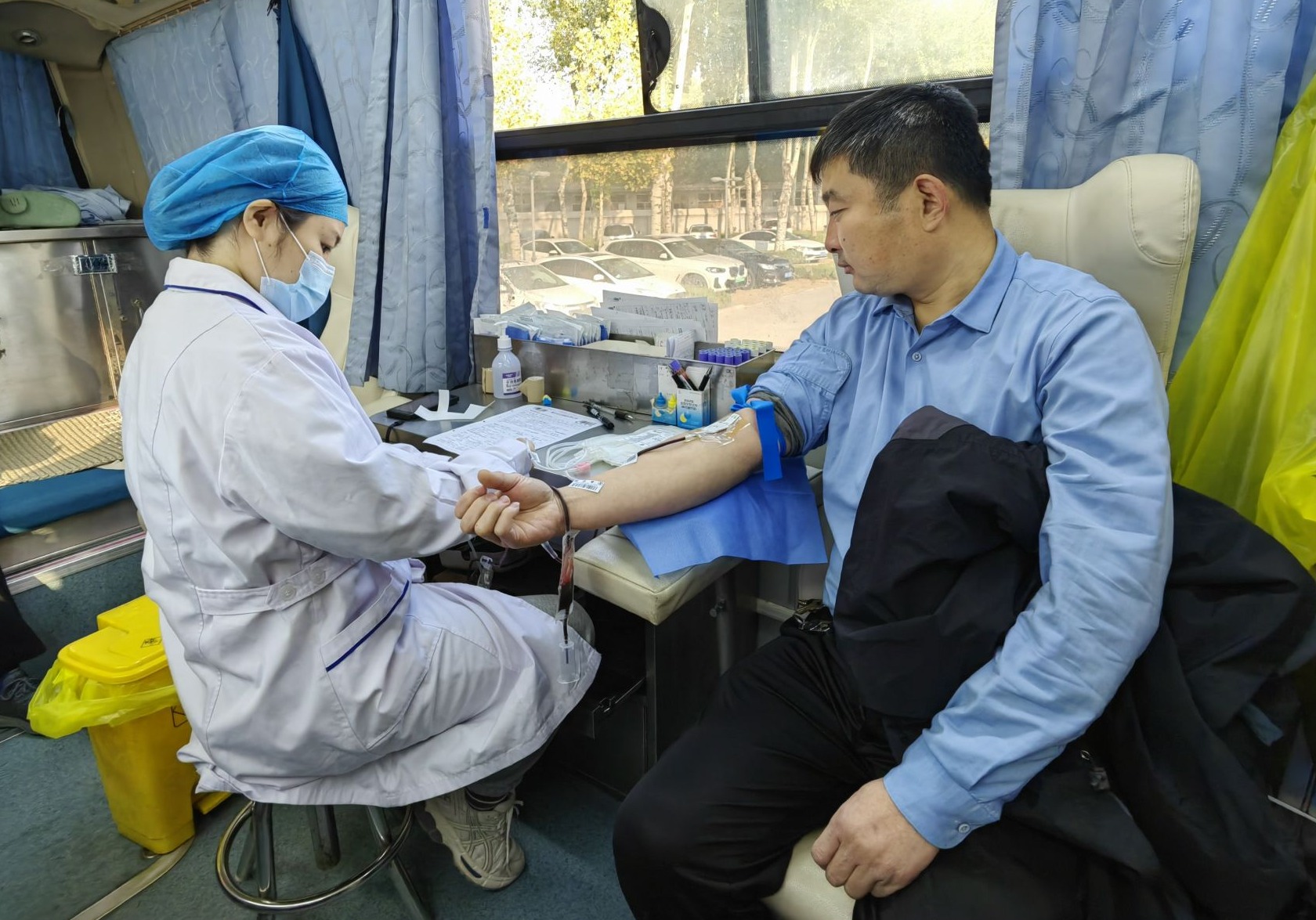 在活动现场的献血队伍中,除了向肖涛涛这样奉献多次的老面孔,还有一些初次加入献血队伍的新生力量。1996年的王玉波是乐陵市商务局的一名工作人员,去年刚参加工作的他,这次在单位同事们的带领下,参加这次活动中。“第一次献血,还有点小紧张。”他笑着为自己加油鼓劲,身旁的同事们也纷纷出言安慰,并分享自己第一次献血的经历。成功献血后,王玉波感觉并无什么不适感。拿到自己的第一张献血证后,他邀请同事帮他拍一张与献血车的合影,留作纪念。“今后我还会积极参加无偿献血,为这项公益事业贡献自己的力量。”王玉波说。