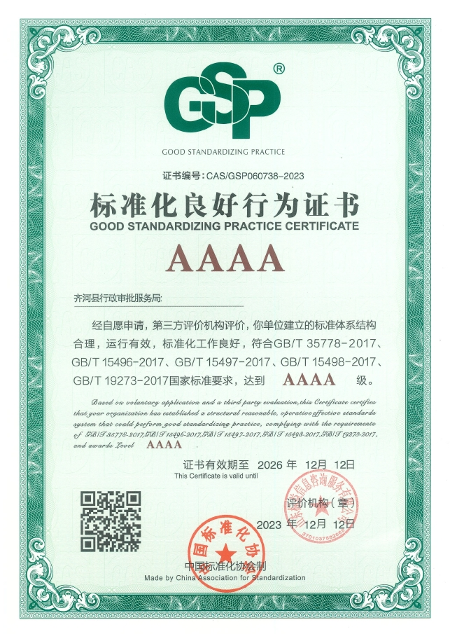 12月12日,齐河县行政审批服务局高分通过了中国标准化协会专家组的评价,获评“AAAA级标准化良好行为”单位。