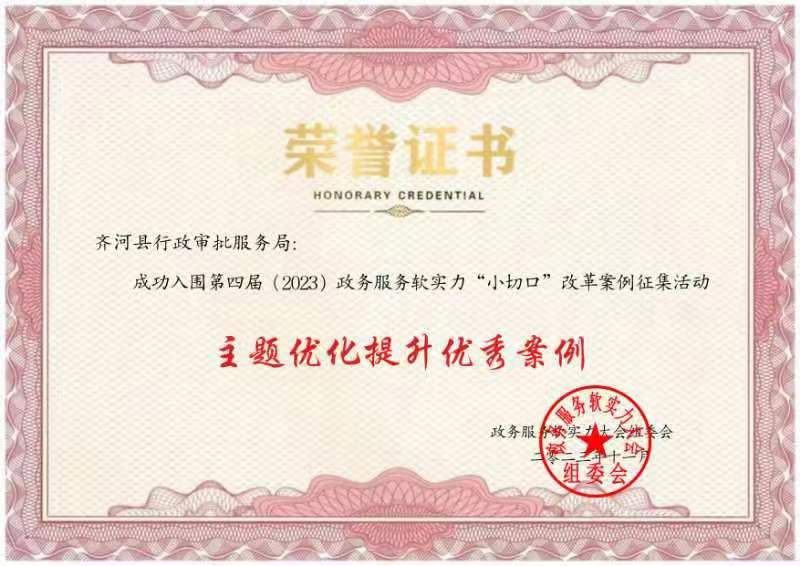 11月29日至30日,2023第四届软实力成果发布大会在河北雄安新区召开,齐河县行政审批服务局报送的《涉农“经营许可办理全托管”》被评为主题优化提升类优秀案例,并录入《政务服务软实力“小切口”改革优秀案例集》在全国推广。
