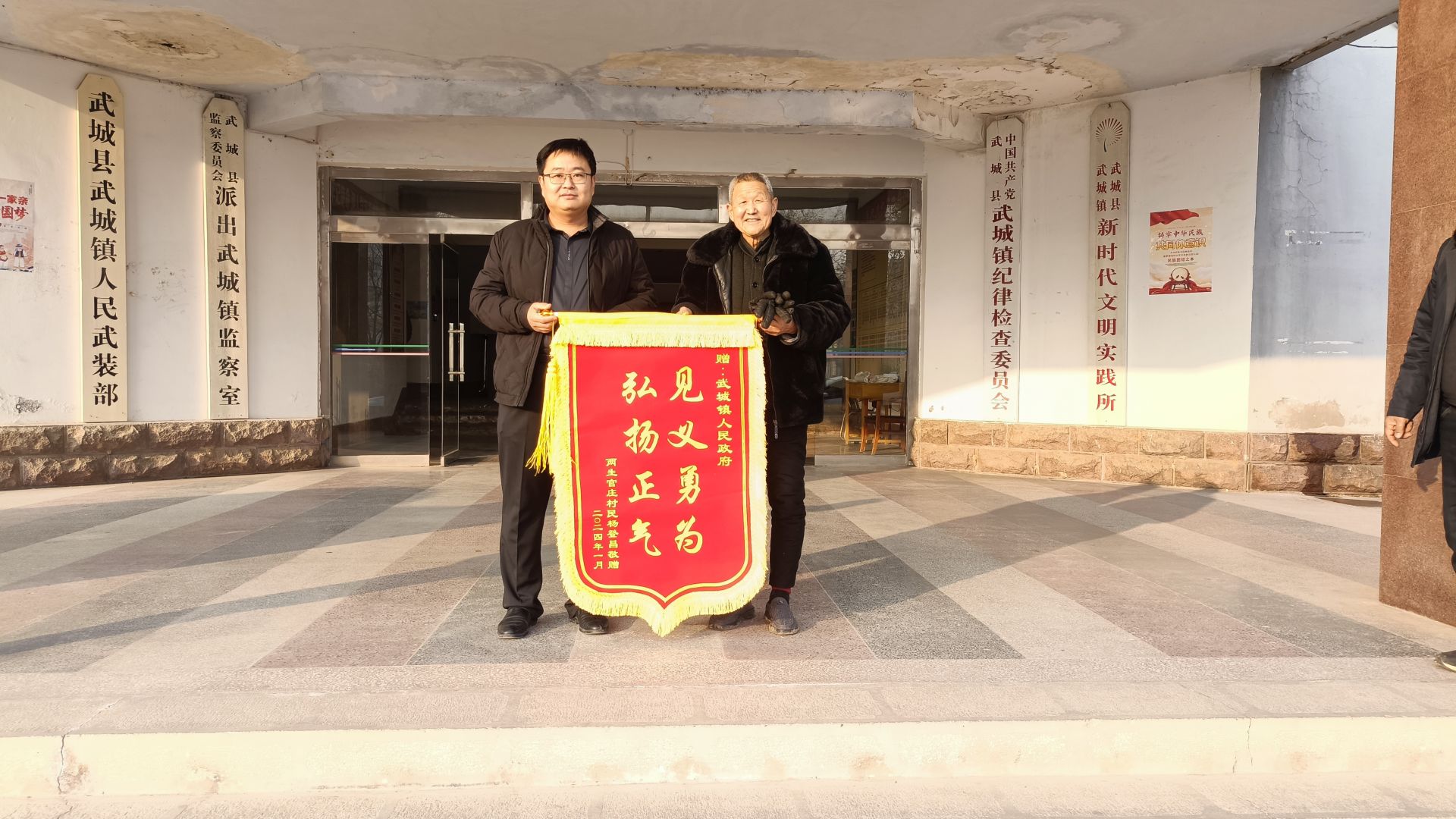 “我们只是做了一件很平常的事情,没想到您老还亲自来一趟,真有点不好意思!”1月11日下午,两升官村党支部书记徐彦军陪着被救老人杨登昌,来到武城镇人民政府,将一面代表感谢的锦旗送到了戚云家、董德齐手中。