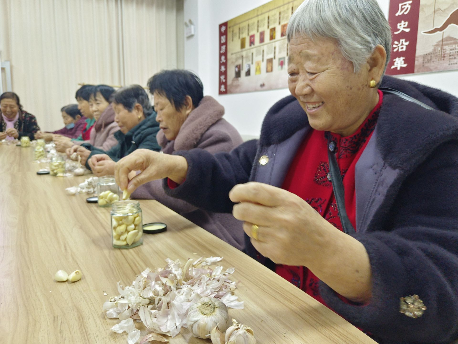 在崇德社区,社区工作人员将准备好的玻璃瓶、大蒜和陈醋分发到每个居民手中,大家伙儿一边剥蒜一边唠家常,活动室内不时传来阵阵欢声笑语,经过一段时间的制作,一罐罐散发着淡淡醋香的腊八蒜新鲜出炉。