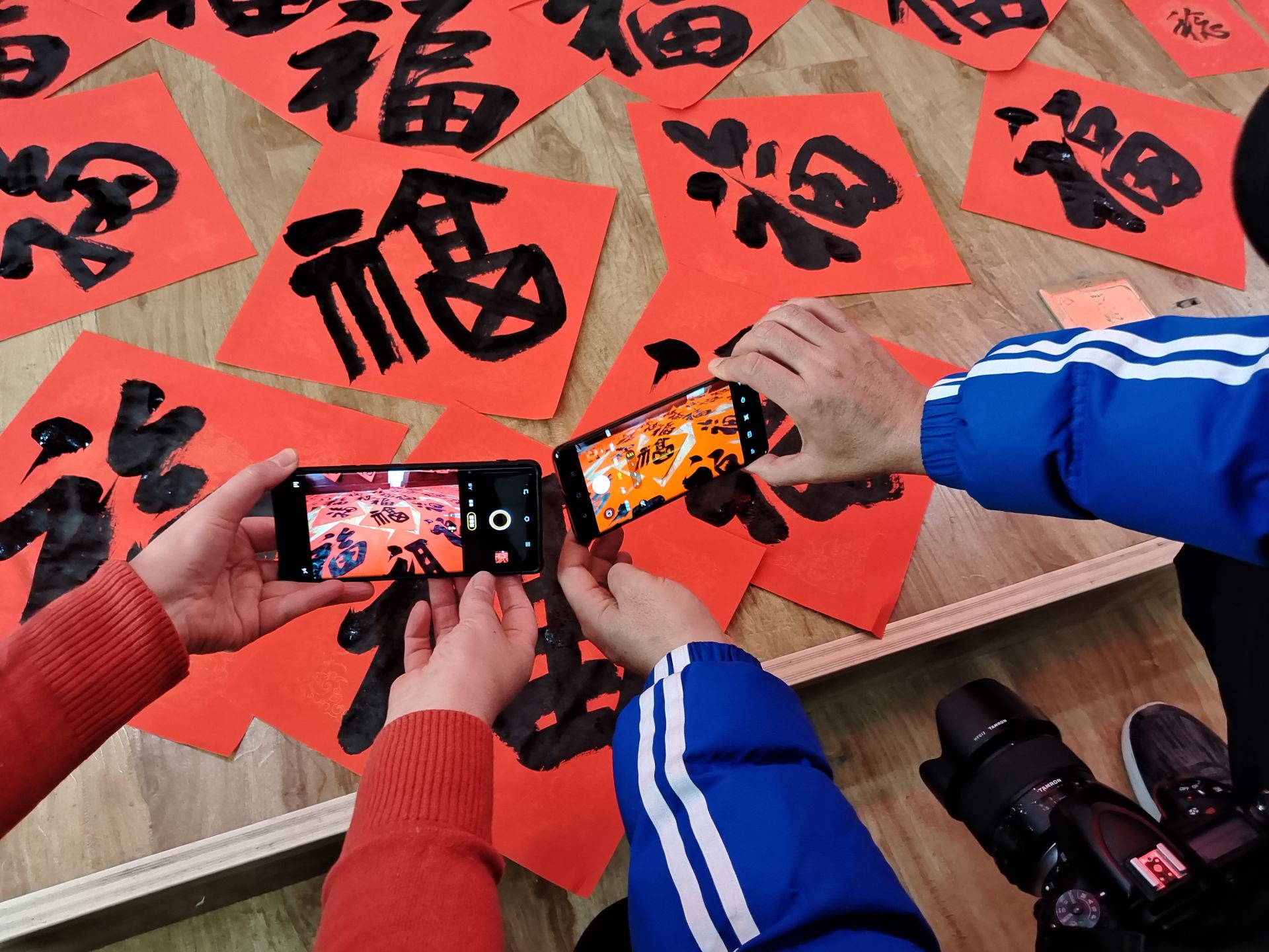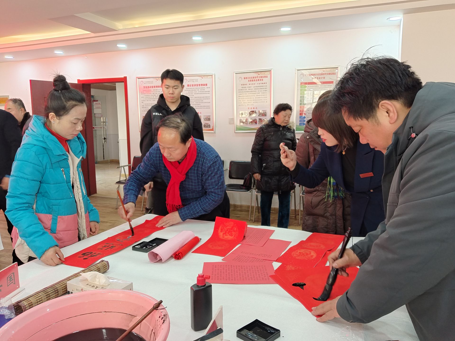 活动现场,12名德州知名书法家现场泼墨挥毫,创作春联、福字等作品,赠送给社区居民,同时社区工作人员和社区志愿者将春联和福字送到辖区老年人和特殊群体家中并帮助张贴。