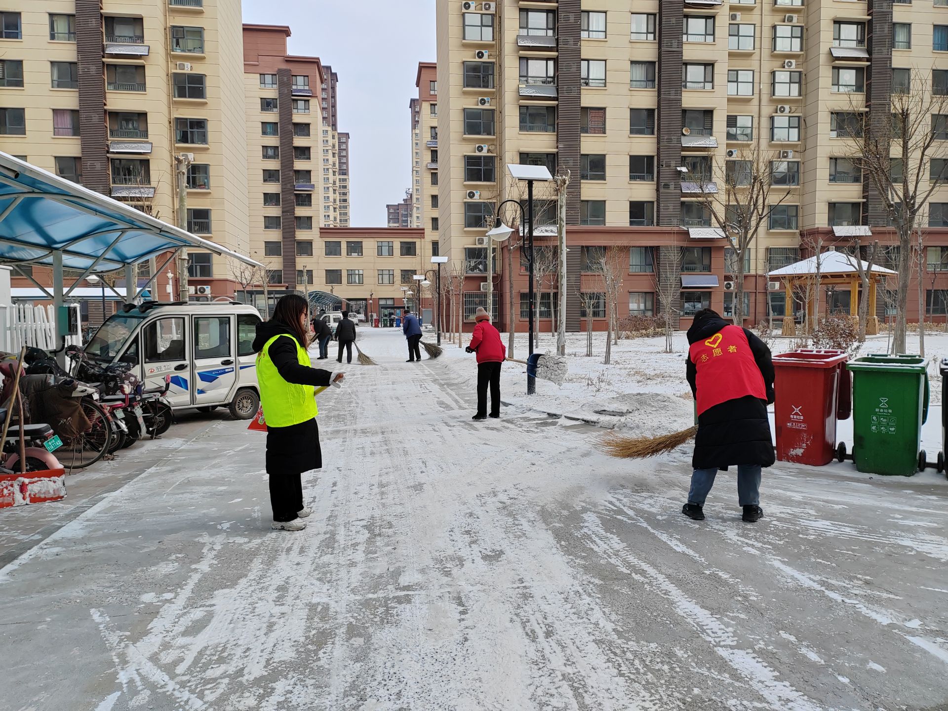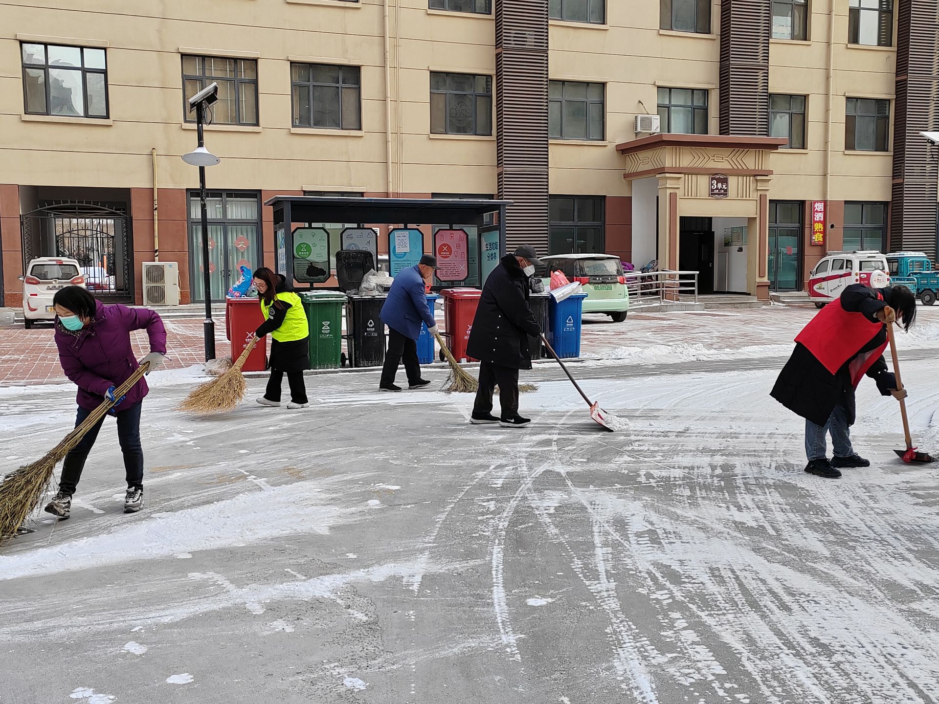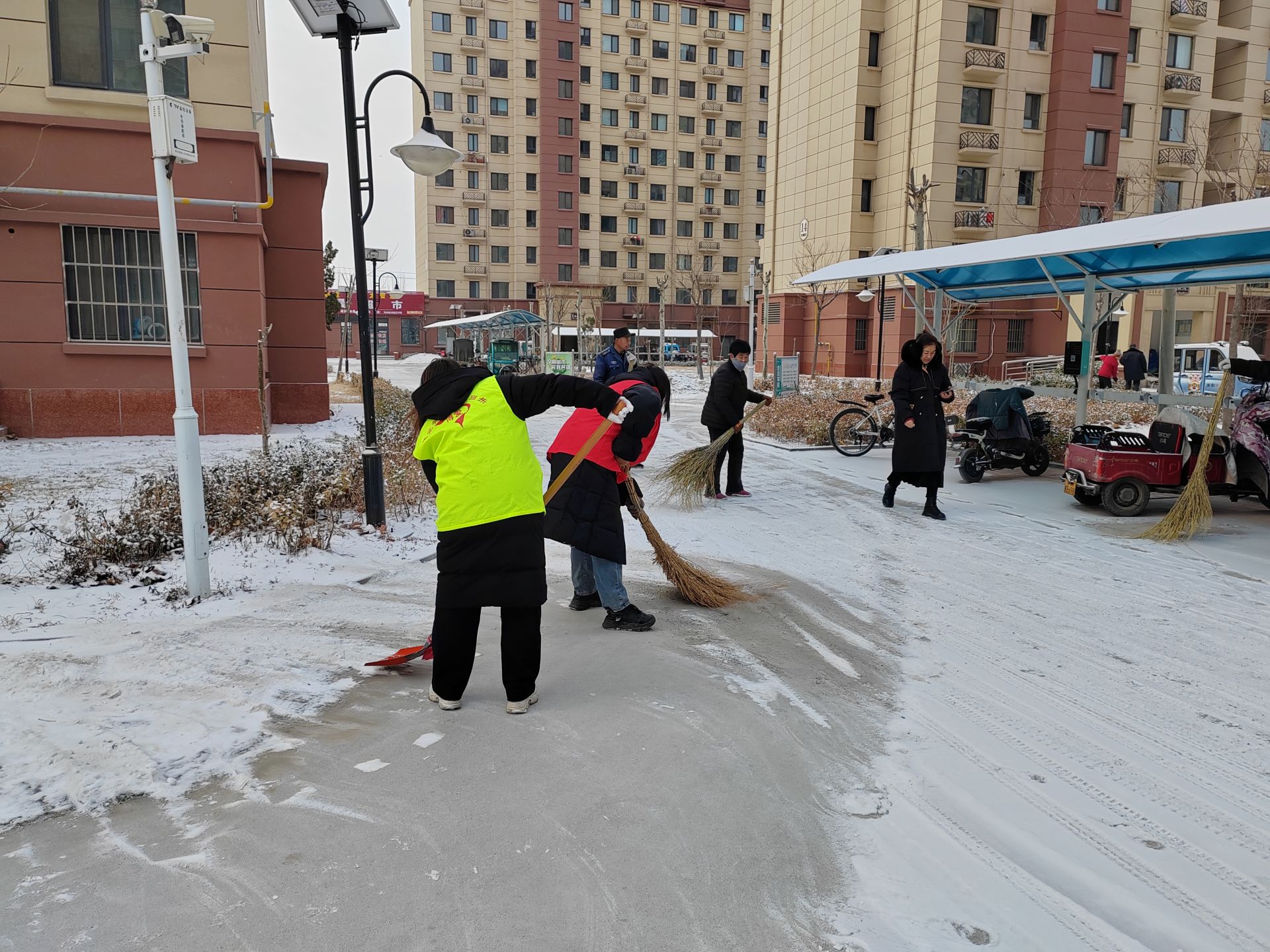 2月4日晚的小雪为此次行动增加了不少难度。一大早,社区工作者来到德达合园小区,与小区的物业工作人员一起,投入了清扫积雪的行动中。大家冒着严寒,戴上手套、手持扫把、铁锹,分工有序,配合默契,干劲十足。拿扫把的人先把路面上的积雪扫到路边,后面拿铁锹的人一铲一铲地把雪推到了路边的花坛里,这样既清理了积雪,又为小区花草来年的成长提供了水分,一举两得。