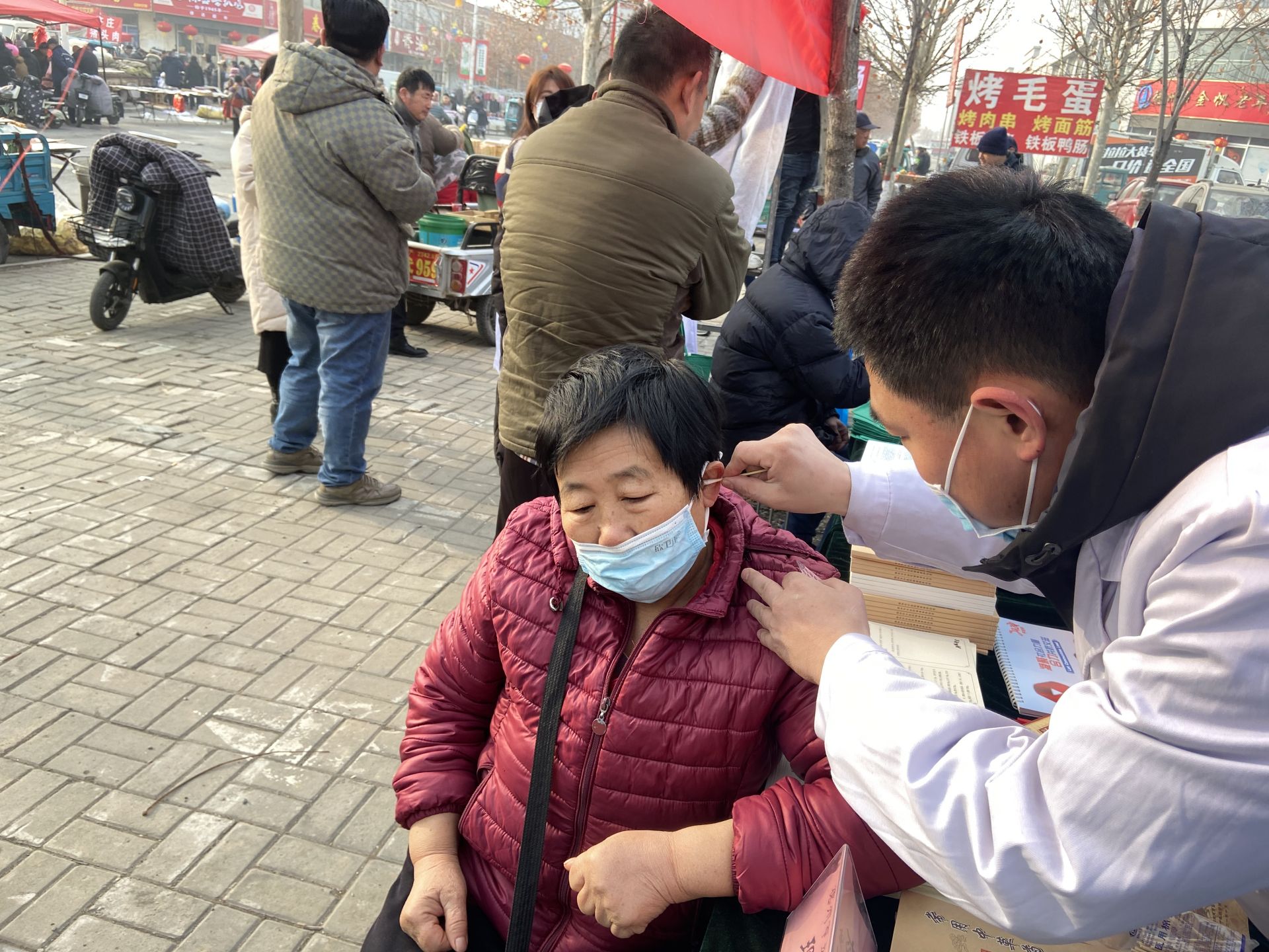来自市立医院的专家提供的耳穴压豆服务项目前排起了长队,专家通过将压豆粘贴于耳穴处,给予适度的揉、按、捏、压,使其产生酸、麻、胀、痛等刺激感应,调整脏腑气血功能,促进机体的阴阳平衡,群众纷纷称赞中医技术的神奇。