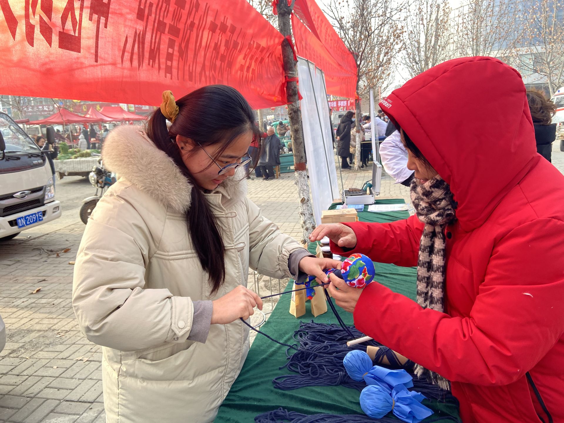 中医药文化产品受到了群众的热烈欢迎。二屯镇卫生院免费为群众提供热气腾腾的中药代茶饮,让年集充满中医药的味道,中医药香囊、台历,给年集增添了中医药文化气息;德城区中医医院的医务人员指导大家现场制作手工艾草经络锤,在体会手工制作乐趣的同时增强群众的健康意识。