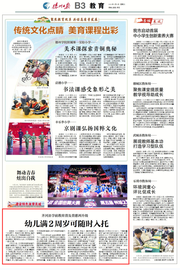 4月份以来,齐河县学前教育普及普惠力度再升级,不仅每月都是开学季,而且将入托门槛降至2周岁,大大缓解了双职工、上班族的压力,构建“覆盖城乡、布局合理、安全优质”的服务体系。目前,全县学前教育公办率达80%,较国家标准高出30个百分点;普惠率达94%,较国家标准高出14个百分点;15项重点、核心指标全部达标。2023年,齐河县被教育部认定为学前教育普及普惠县。