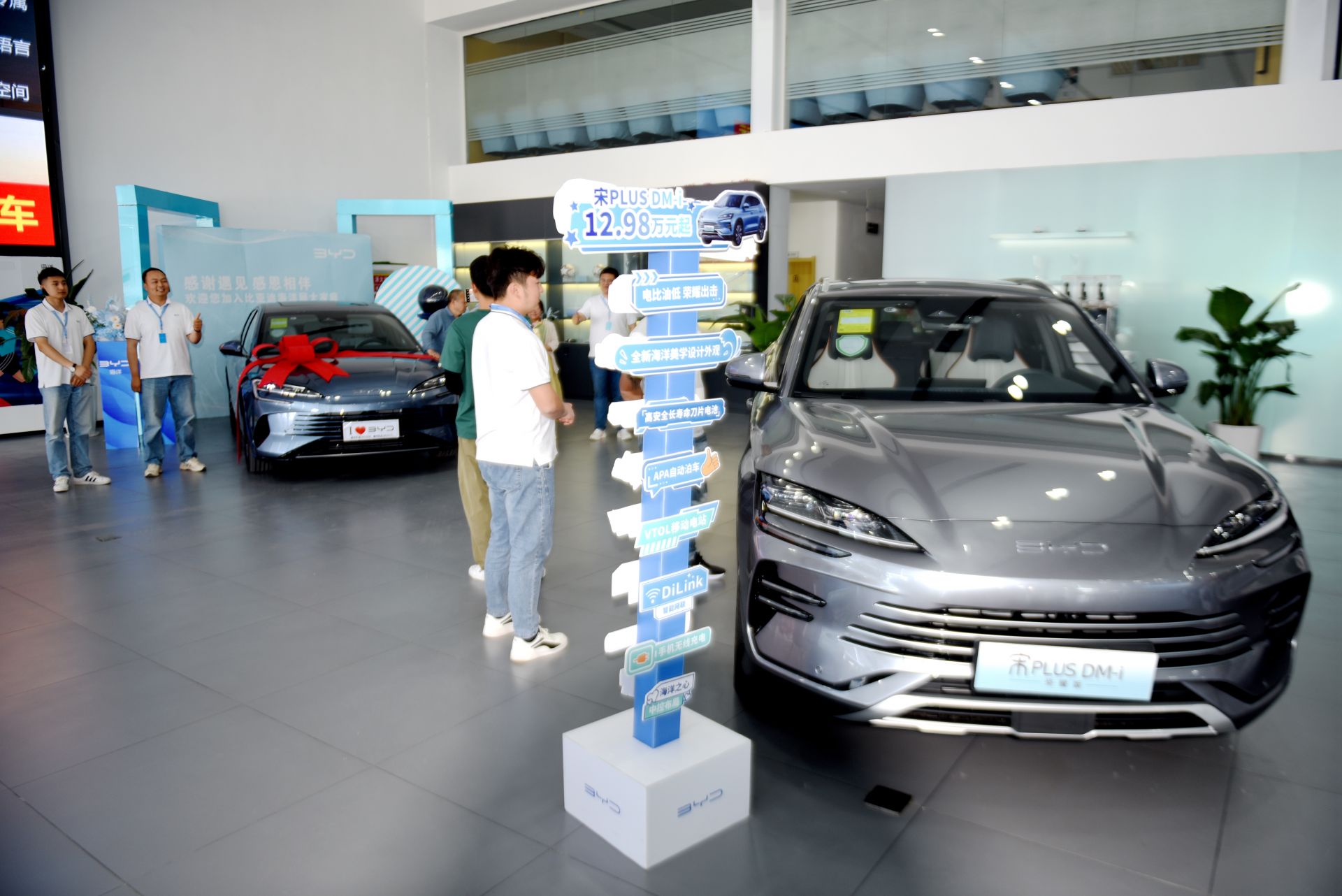 5月12日,几名市民在天衢新区德百汽贸城的比亚迪4S店选购汽车,客户经理详细介绍以旧换新补贴政策,补贴额度最高可达1.8万元。
