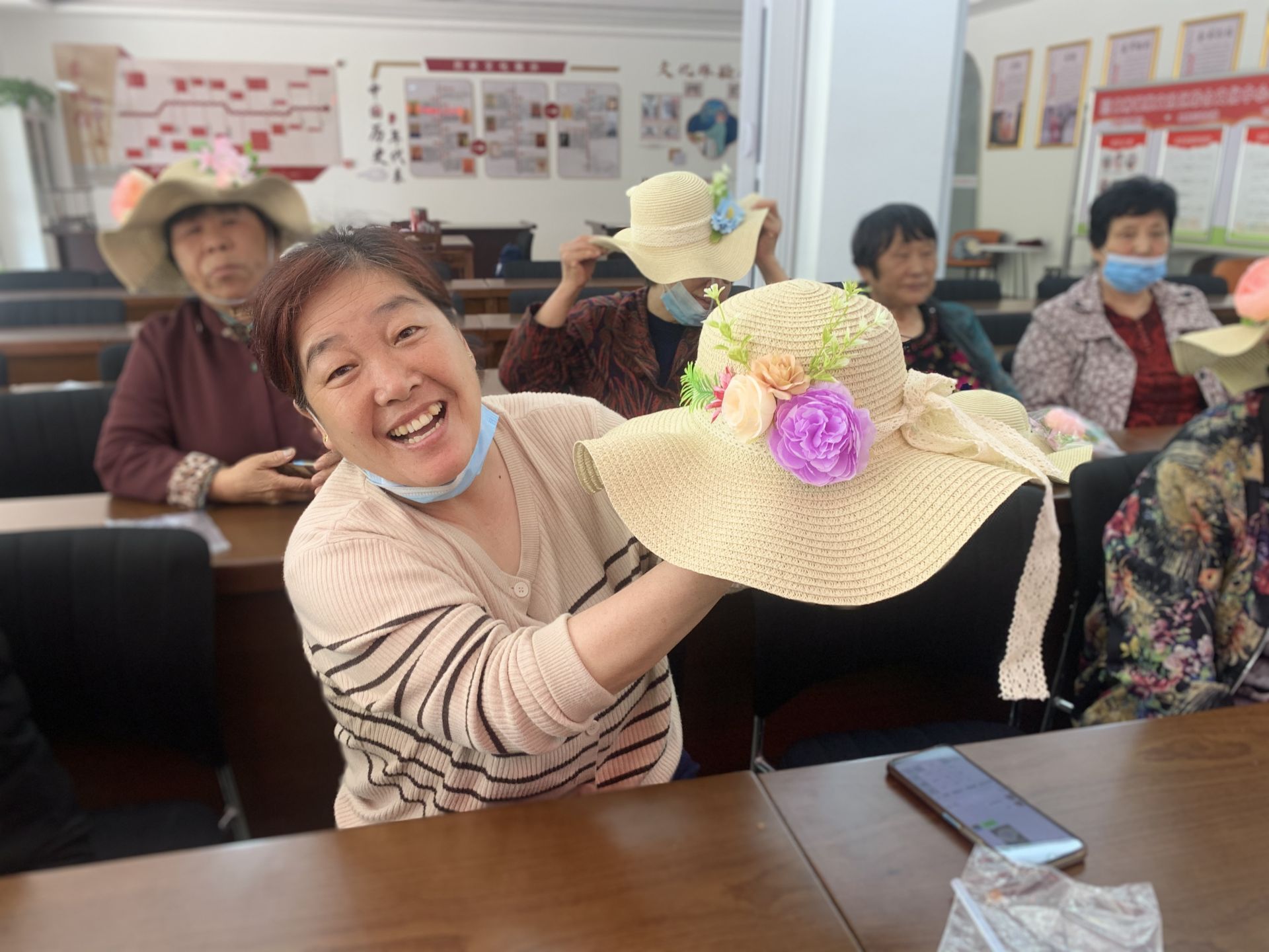 崇文社区组织居民动手用制作草帽,在制作过程中,大家你一言我一语地一边聊着家常,一边制作草帽,有的聊起自己的母亲,有的说起自己的孩子,大家共同感受母亲节的气氛,场面和谐而温馨。经过大家的努力,一顶顶色彩斑斓、造型各异的花艺草帽在居民们的手中诞生。大家纷纷戴上自己精心制作的花艺草帽,展示着自己的美和劳动成果。