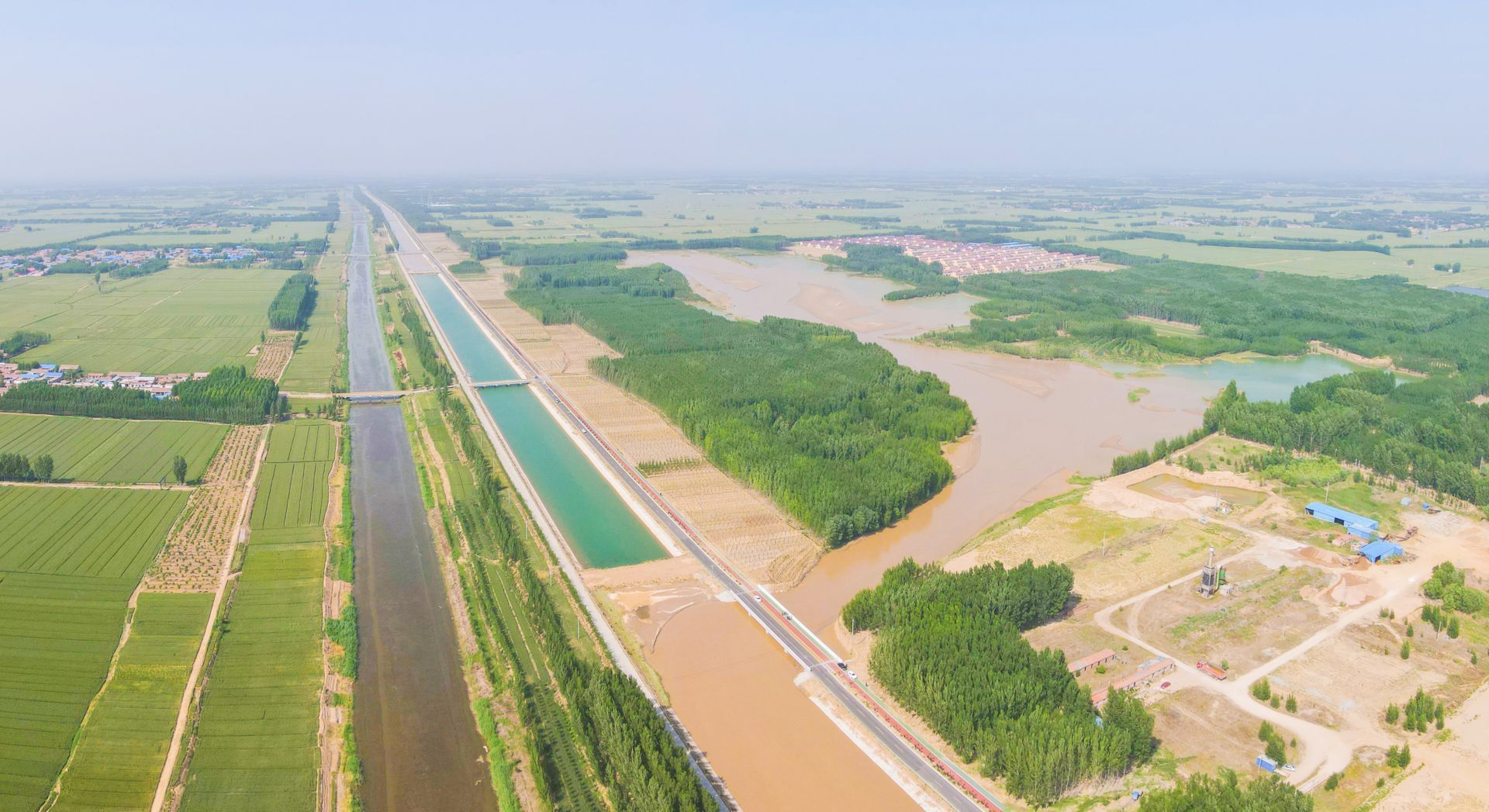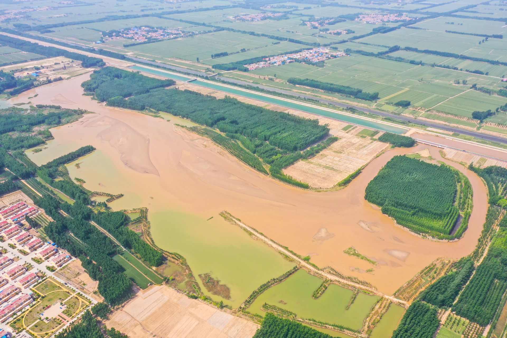 立于禹城市莒镇莒东社区高处,社区西边的沉沙池湿地全貌尽收眼底:黄河水通过引黄干渠进入沉沙池引水口,随着水流降速,大量泥沙沉淀下来,经过沉沙池的过滤,又从出水口重新流回干渠,黄河水和引黄干渠的水呈现黄绿两个颜色的交汇。