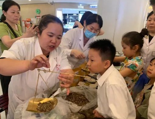 活动现场,医务人员为前来咨询的群众免费测血压,针对夏季常见病、多发病进行健康指导,以“望闻问切”的形式把脉问诊,向群众讲解中医诊疗知识及中医养生保健知识。药学部工作人员现场展示了医院代茶饮、常用中草药等,还准备了乌梅汤供市民免费品尝,并教小朋友们制作中药香囊。