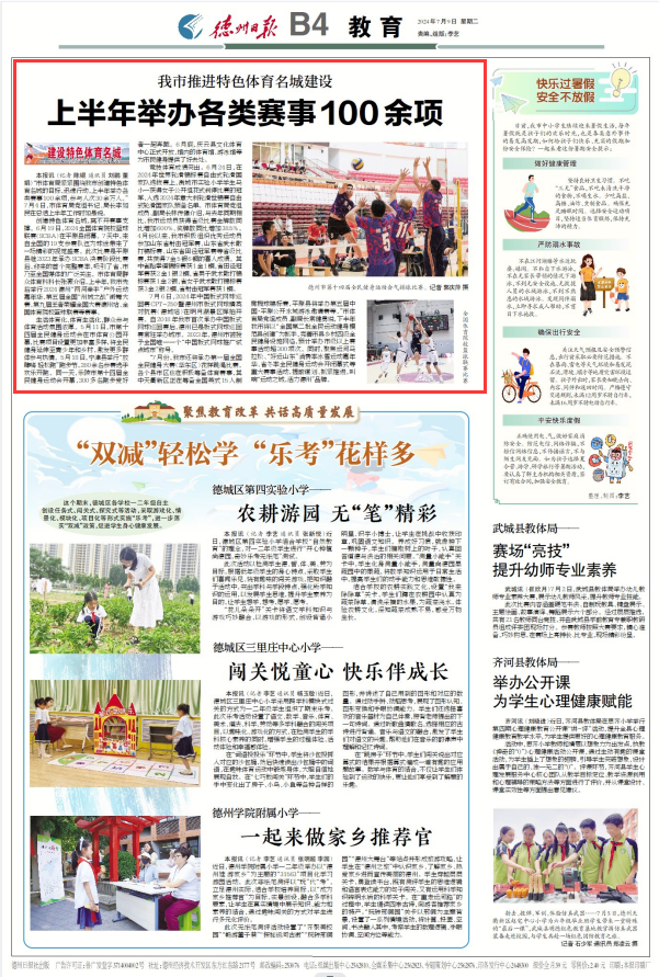 “7月份,我市还将承办第一届全国全民健身大赛(华东区)花样跳绳比赛。各个县市区也在积极筹备体育赛事,其中天衢新区正在筹备全国英式15人制橄榄球锦标赛,平原县将举办第五届中国·平原公开水域游泳邀请赛等。”市体育局党组成员、副局长常健勇说,下半年我市将以“全国第二批全民运动健身模范县创建”为抓手,完善市县乡村四级全民健身设施网络,预计举办市级以上赛事活动超300项次。同时,聚焦运河马拉松、“好运山东”消费季冰雪运动嘉年华、省冬季全民健身运动会开闭幕式等重大赛事活动,提前谋划、抓紧推进,叫响“运动之城,活力德州”品牌。