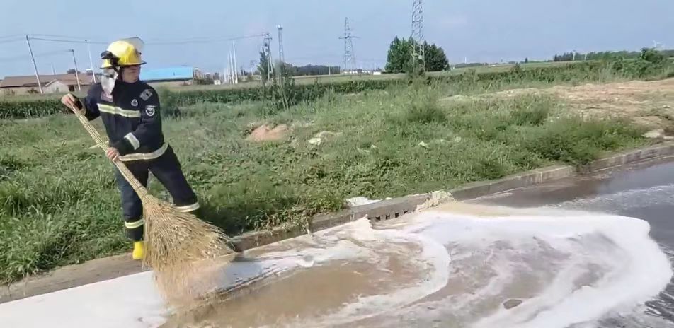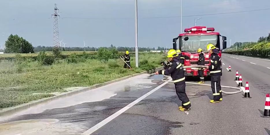 8月14日,德州市消防救援支队指挥中心接到了报警,北外环与高铁东大道交叉口(赵虎镇姜庄村)附近一罐车糖蜜因高温发酵溢出,求助消防清理路面。接警后,晶华北路消防救援站迅速出动,赶赴现场处置。