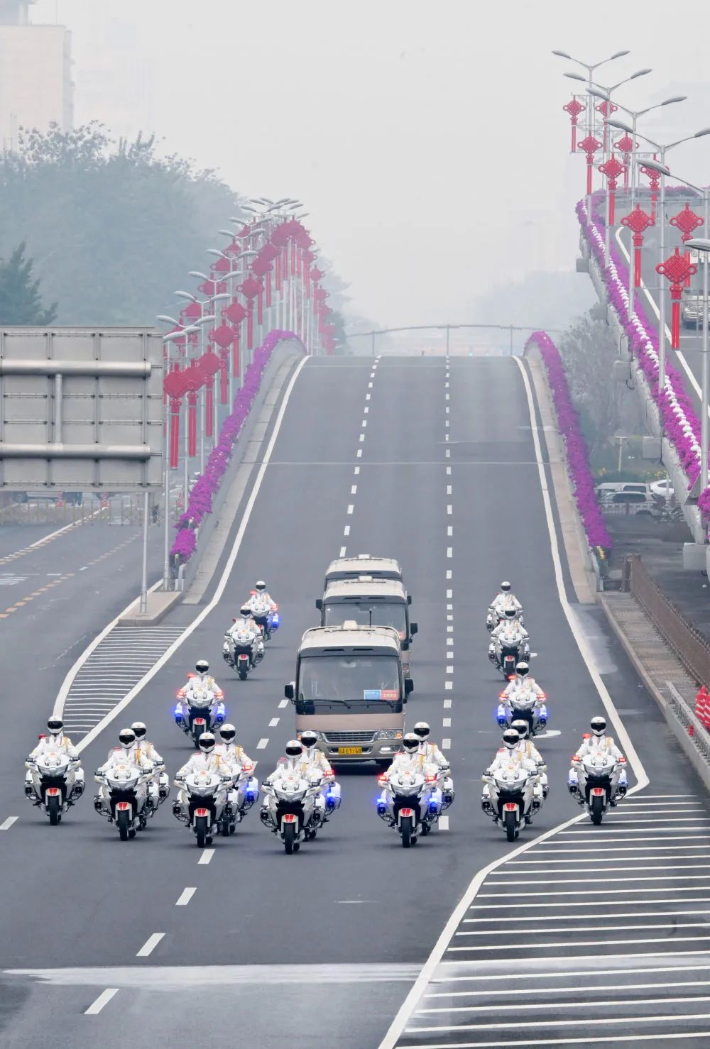 礼宾摩托车队组成V字形车阵