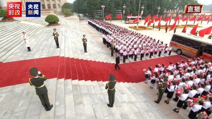 礼兵列队、少年儿童手持花束迎候