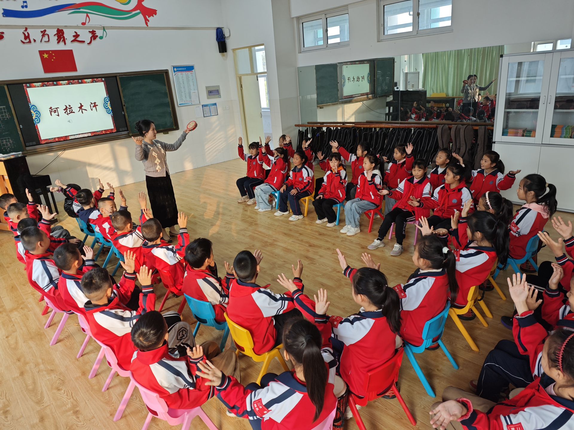 第一节课是黄河涯校区尹泊予老师执教的《阿拉木汗》,带领学生感受了维吾尔族音乐的节奏特点,深入体验中国民族音乐的魅力。第二节课是由德州市新湖北路小学岳佩蓓老师执教的《白鸽》。岳老师通过精心设计的音乐主题,带领学生练习轮唱,让学生在音乐中充分感受不同情境与情感,融合音画魅力,体会动人艺术。第三节课是由区电教中心徐淼老师带来的《田野在召唤》。在学习过程中,徐老师不仅引导学生对比聆听了不同版本的作品,深刻感受作品内涵的情感;同时还展示了自己精湛的专业技能,带领学生体会了歌曲的表现力及音乐性。第四节课是由德州市实验小学高向阳老师执教《小红帽》,高老师用故事、乐曲导入课题,让学生沉浸式感知音乐情绪,产生音乐共鸣,进入课堂状态。课堂上,高老师不断引导学生运用优美的声音,在轻松愉悦的情绪中演唱歌曲。