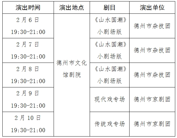 从2月6日(正月初九)到10日(正月十三),将在市文化馆剧院连续推出惠民演出,每天1场。所有演出均采用免费领票,凭票观看的形式进行。具体演出安排如下: