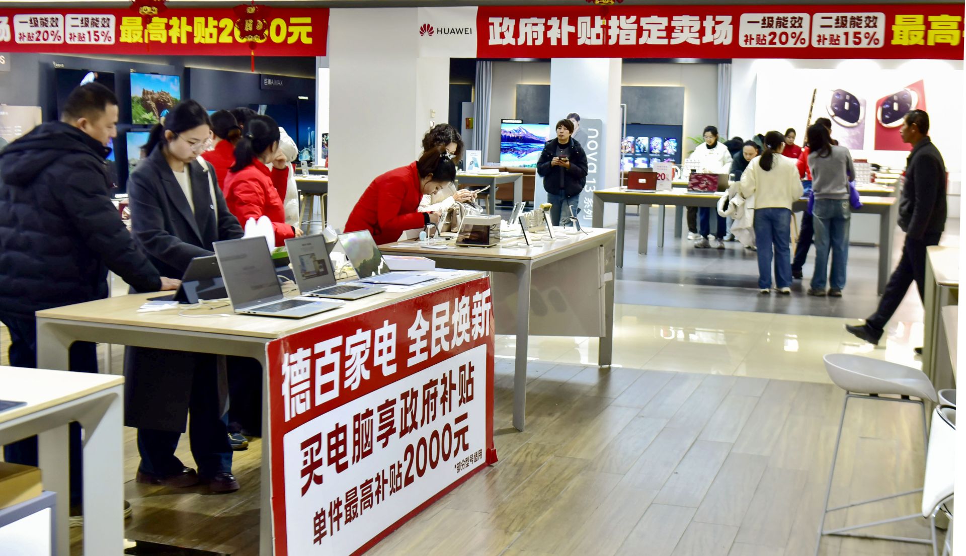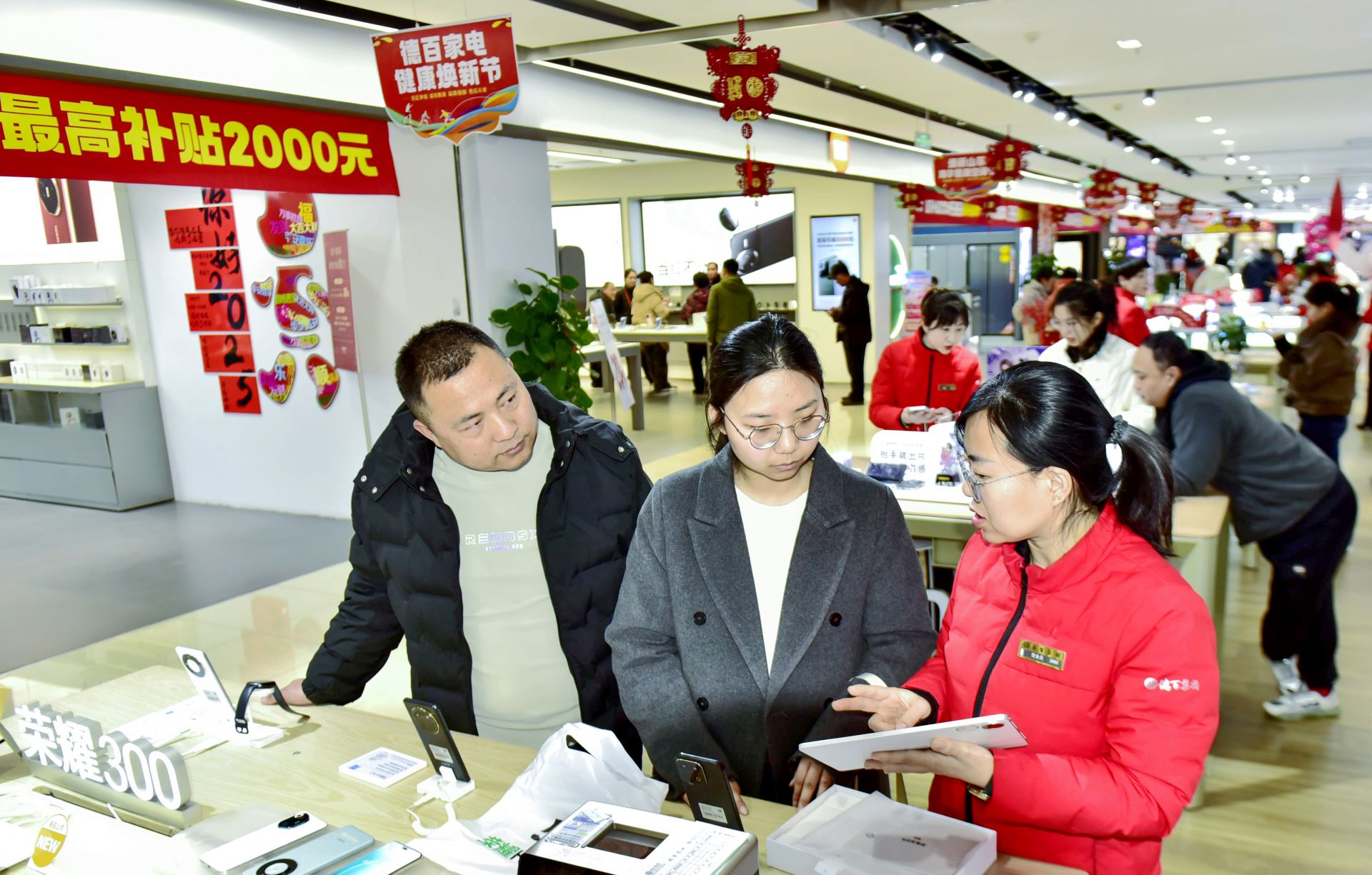 连日来,德百家电大楼店内人头攒动,尤其是数码产品柜台前更是热闹非凡。这一景象得益于新一轮以旧换新政策的全面铺开,以及国家对手机等数码产品的补贴政策。