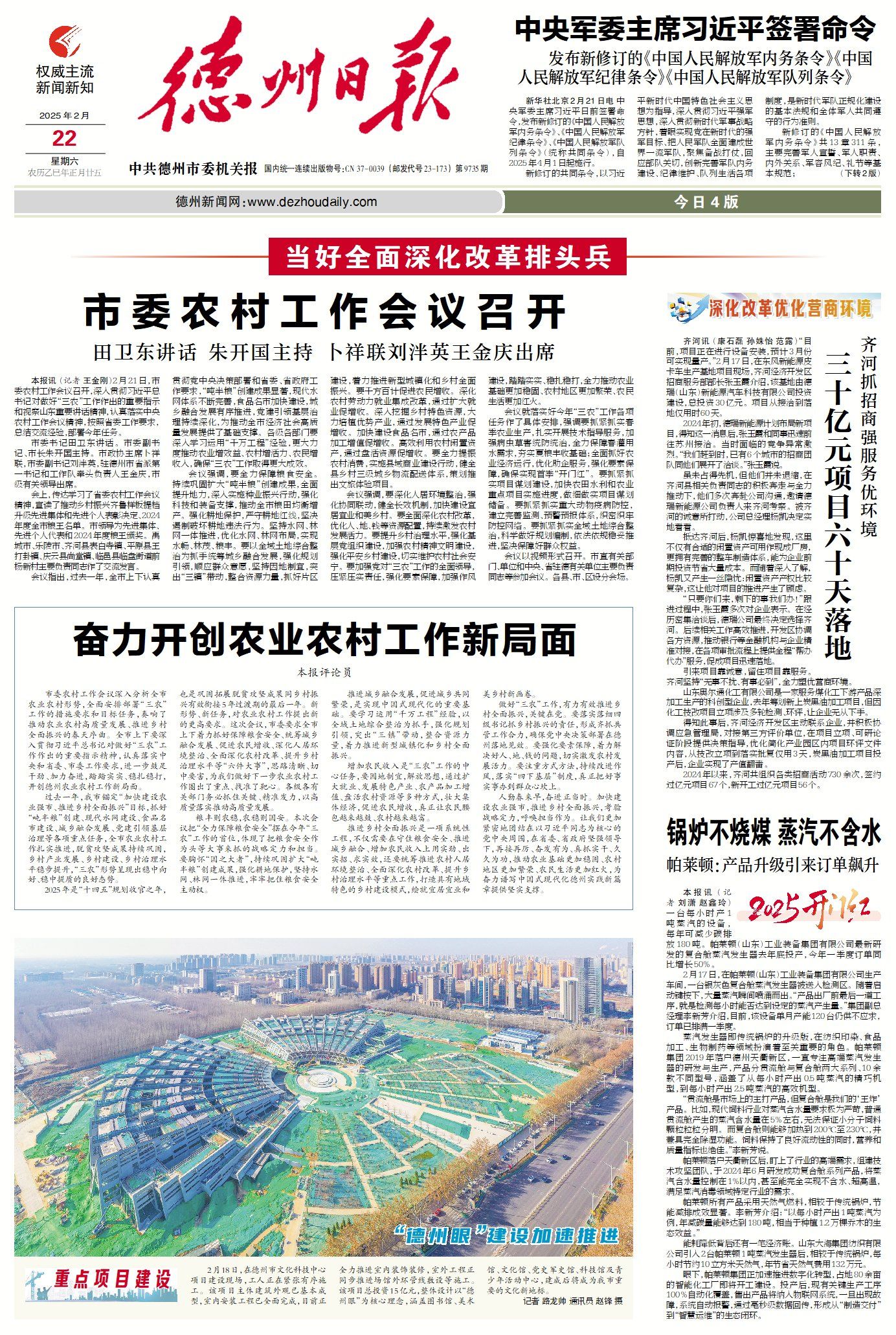 市委农村工作会议深入分析全市农业农村形势,全面安排部署“三农”工作的措施要求和目标任务,奏响了推动农业农村高质量发展、推进乡村全面振兴的春天序曲。全市上下要深入贯彻习近平总书记对做好“三农”工作作出的重要指示精神,认真落实中央和省委、市委工作要求,进一步鼓足干劲、加力奋进,踏踏实实、稳扎稳打,开创德州农业农村工作新局面。
