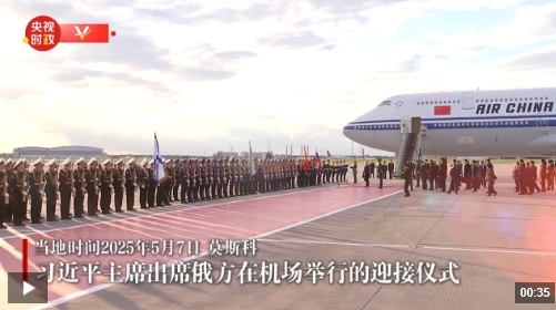 当地时间5月7日晚,国家主席习近平乘专机抵达莫斯科,应俄罗斯总统普京邀请,对俄罗斯进行国事访问并出席纪念苏联伟大卫国战争胜利80周年庆典。