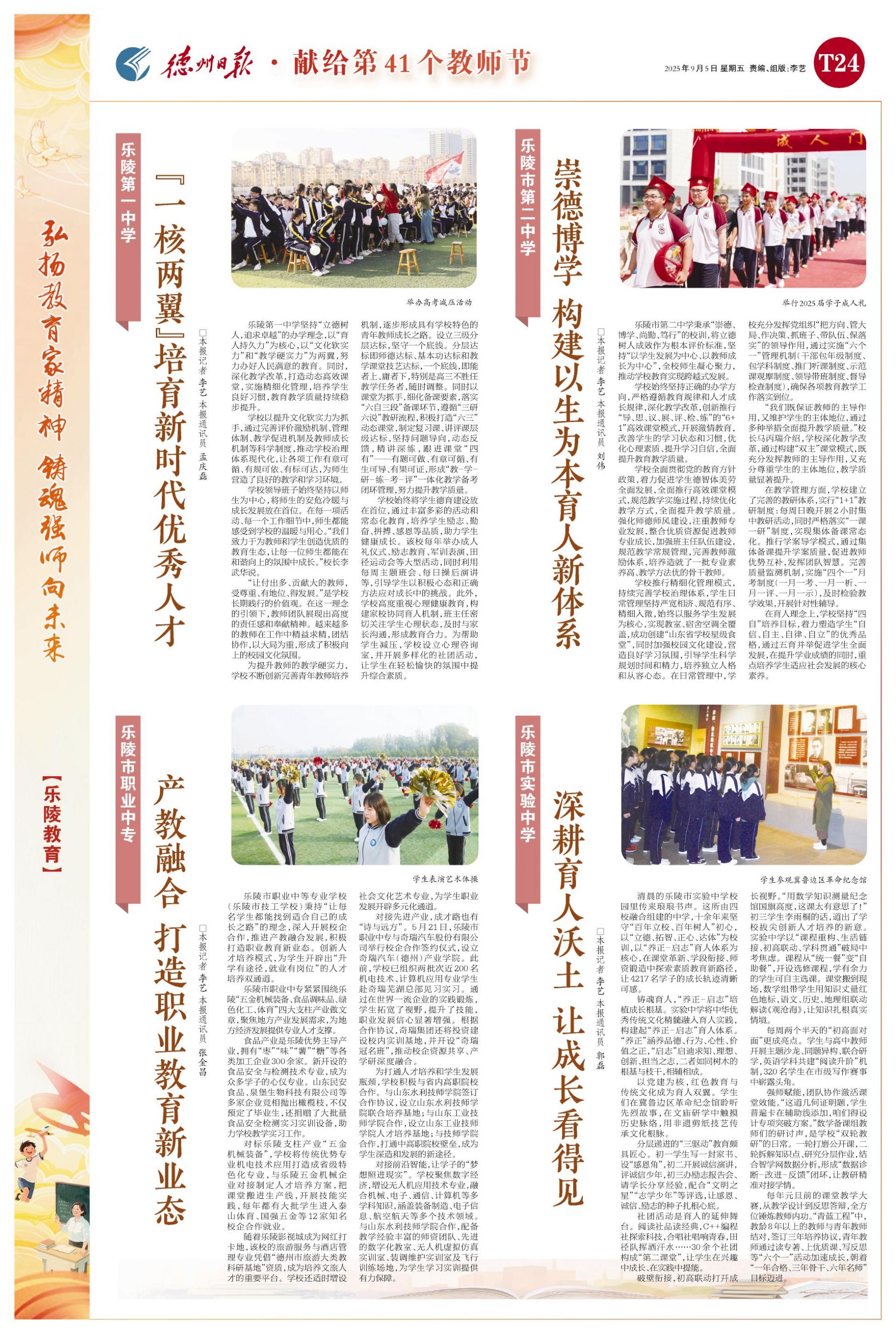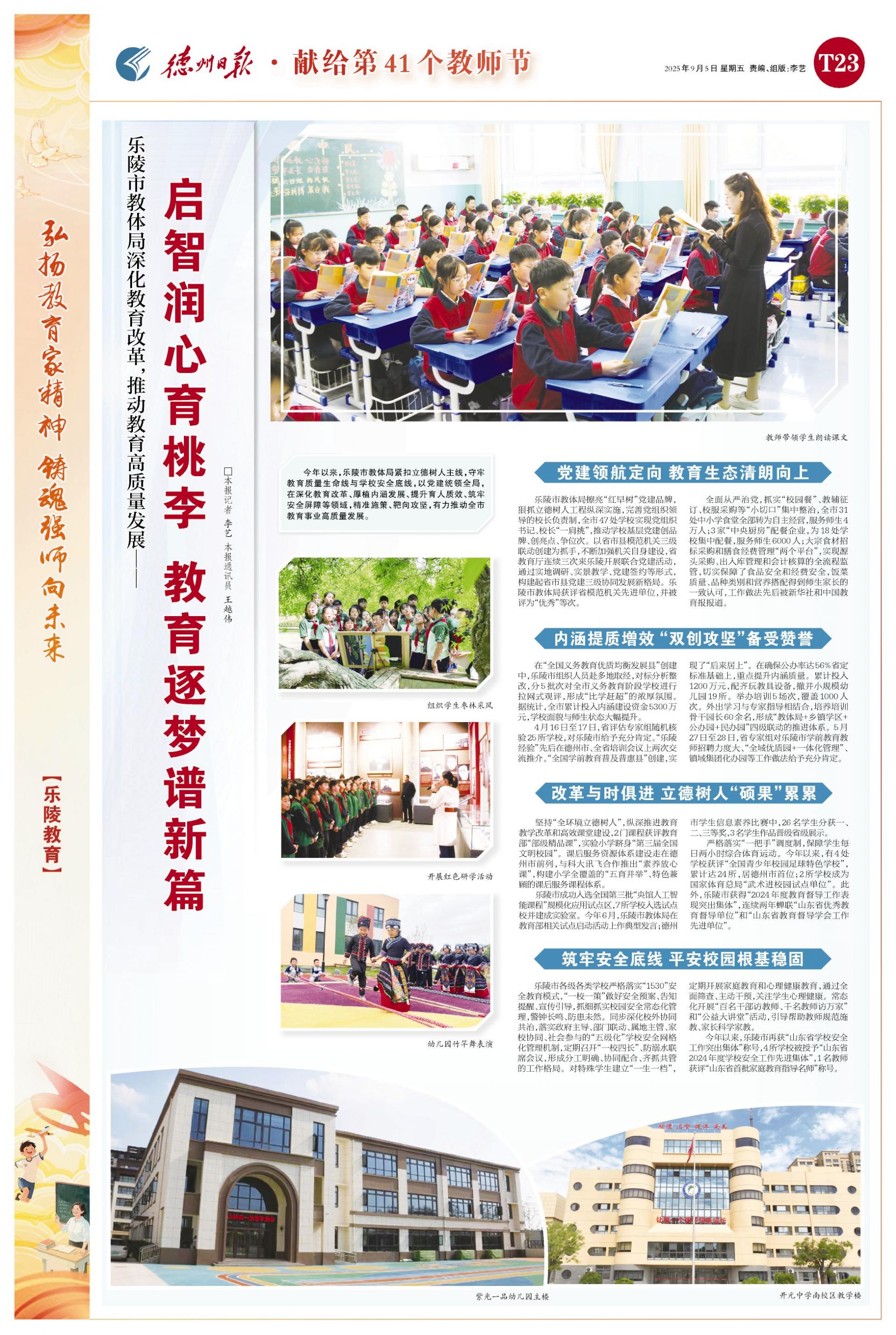 党建引领铸根魂。乐陵市坚持把党的领导贯穿教育教学全过程,以师德师风建设为关键抓手,常态化推进教育生态治理,推动师德师风建设常态长效。聚焦群众关心关切的“校园餐”、教辅征订、校服采购等教育民生领域,深入开展不正之风专项整治,划清师德底线、规范教师行为、严惩失德之举,力促教育系统持续转作风、强服务、提素养,打造风清气正、无私奉献的良好教育行风,办好人民群众满意的教育。