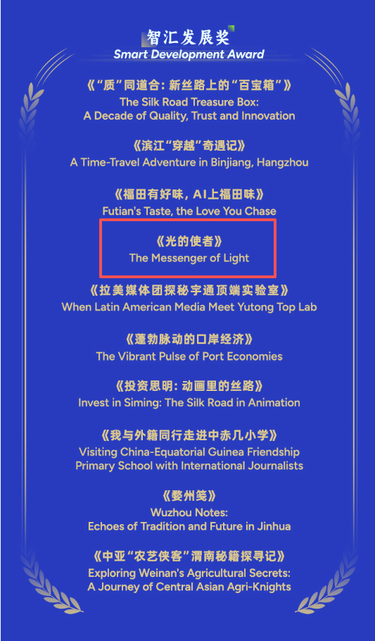 近日,第七届“一带一路”百国印记短视频大赛获奖作品正式揭晓。经过三轮严苛遴选,德报短视频作品《光的使者》在全球130余国家和地区近2000部作品中脱颖而出,荣获“智汇发展奖”。