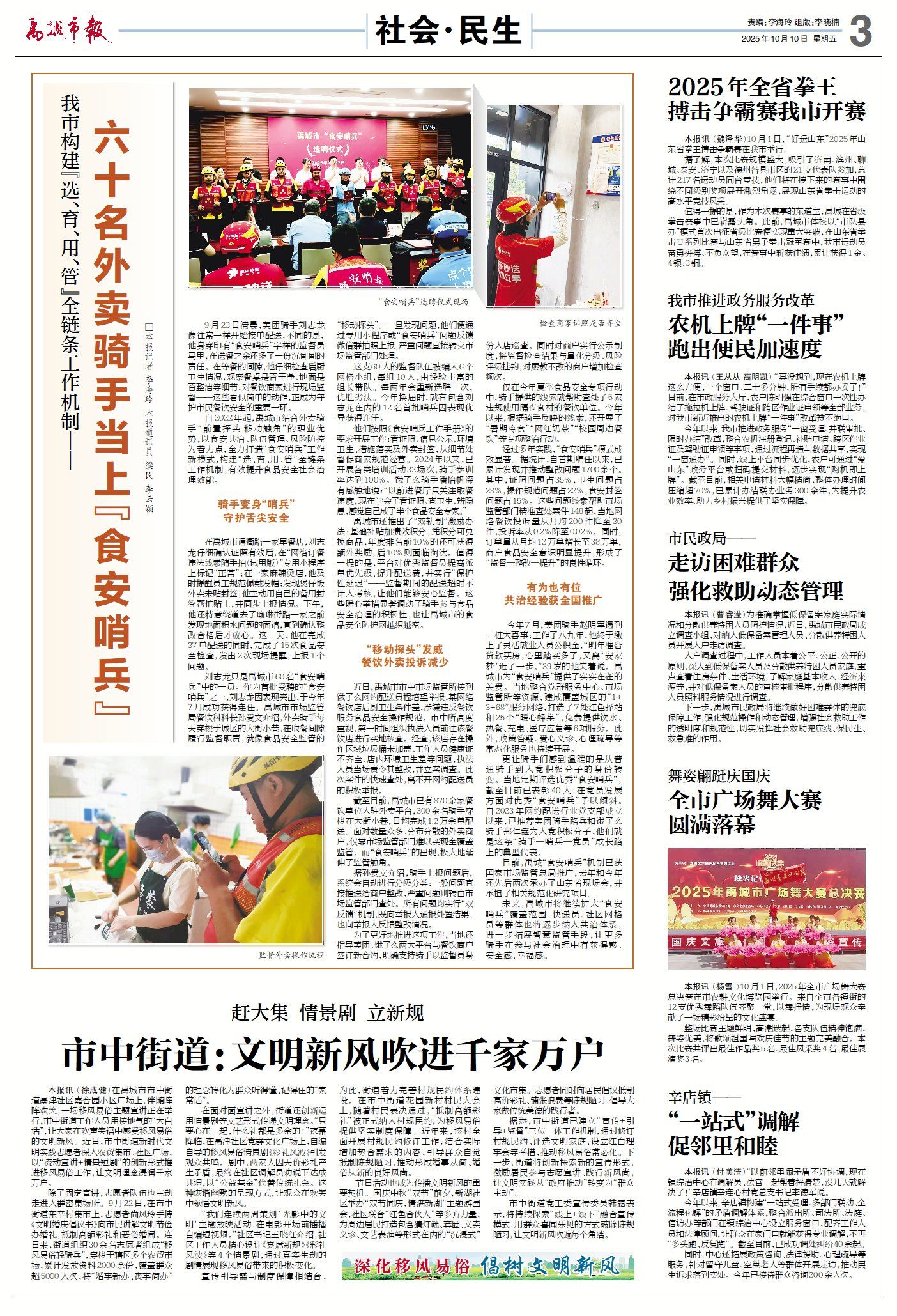 ▶禹城构建“选、育、用、管”全链条工作机制:六十名外卖骑手当上“食安哨兵”。(查看详情)