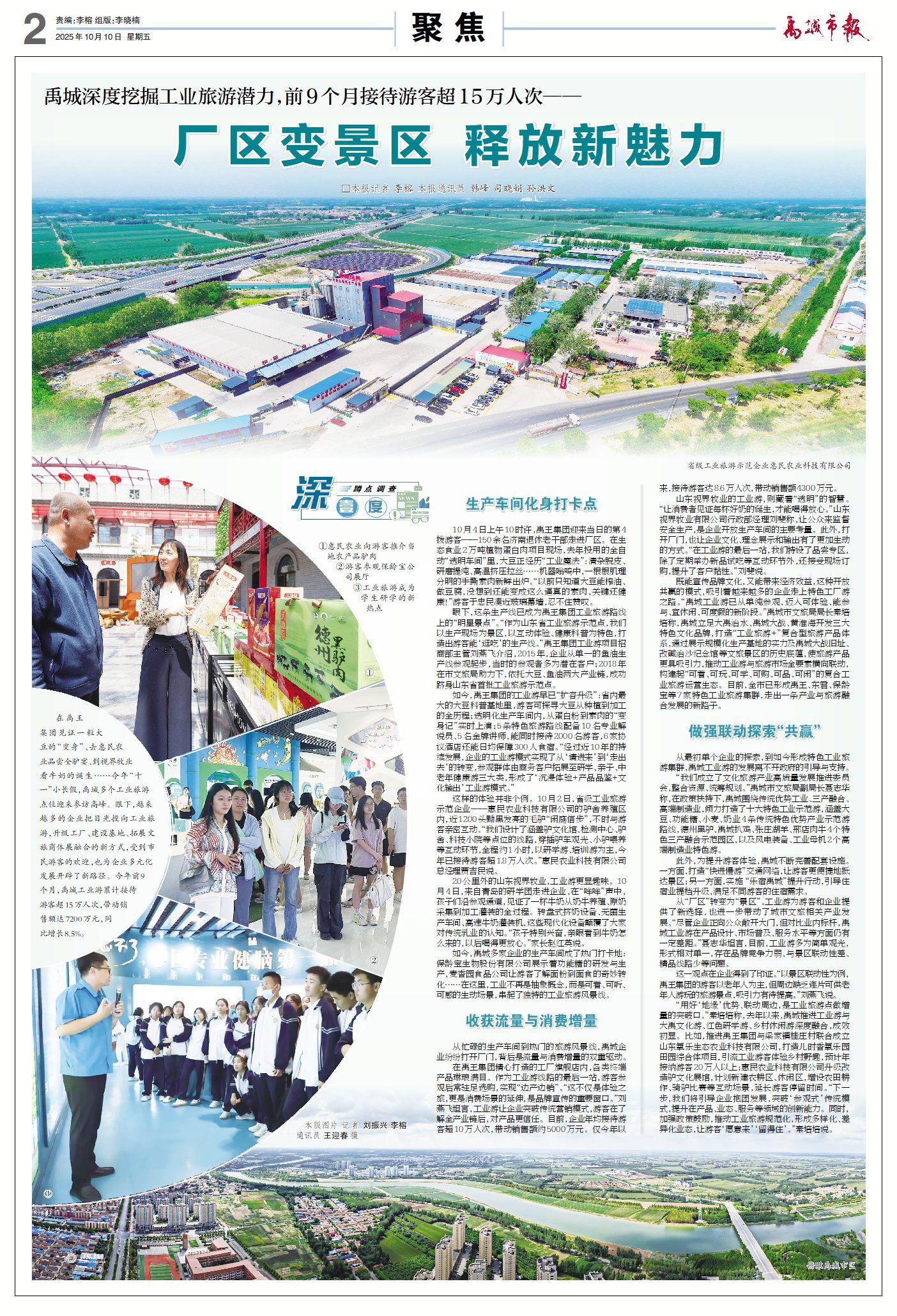 ▶禹城深度挖掘工业旅游潜力,前9个月接待游客超15万人次 | 厂区变景区 释放新魅力。(查看详情)