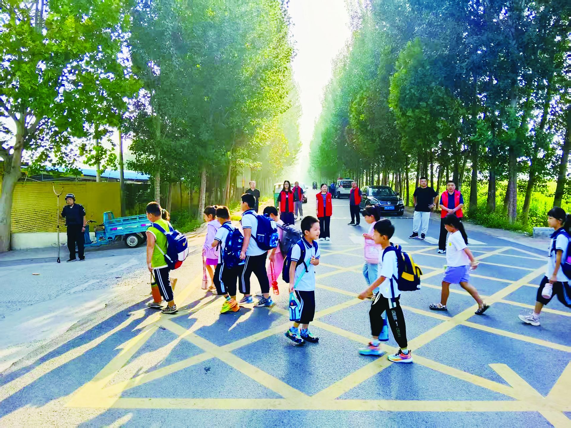 每当朝阳初升或夕阳西下,齐河县宣章屯镇各学校门口便迎来一天中最繁忙的时刻。校门前,身着制服的值勤人员忙碌穿梭:机关领导干部手举指示牌引导车辆,民警警惕地巡视周边,教师温柔地牵起学生小手,党员干部挥动着小旗疏导人流,保安则守在校门两侧维持秩序。这支由多方力量组成的“护学队伍”,如一道坚固的屏障,为学生筑起平安通道。两年来,全镇3所学校“护学岗”出勤率均为100%,实现了全覆盖,成为家长口中的“安心守护者”。
