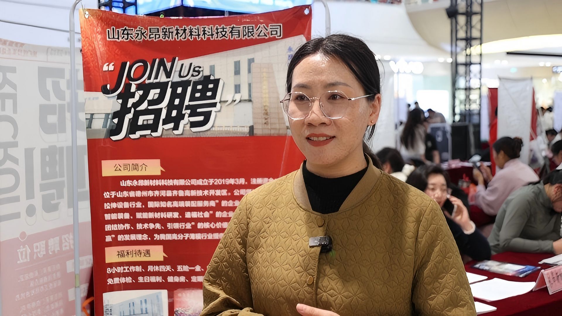 山东永昂新材料科技有限公司人力资源部经理翟松梅说:“我们这一次提供了10个岗位,主要涵盖了电器、机加工、钣金三个方面。因为我们是做拉伸薄膜整机设备的,所以我们分了这三大类,精准的对接一些机械专业还有电气专业的学生。希望通过这次招聘会,能为我们招到高素质、高品质的人才”。
